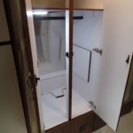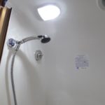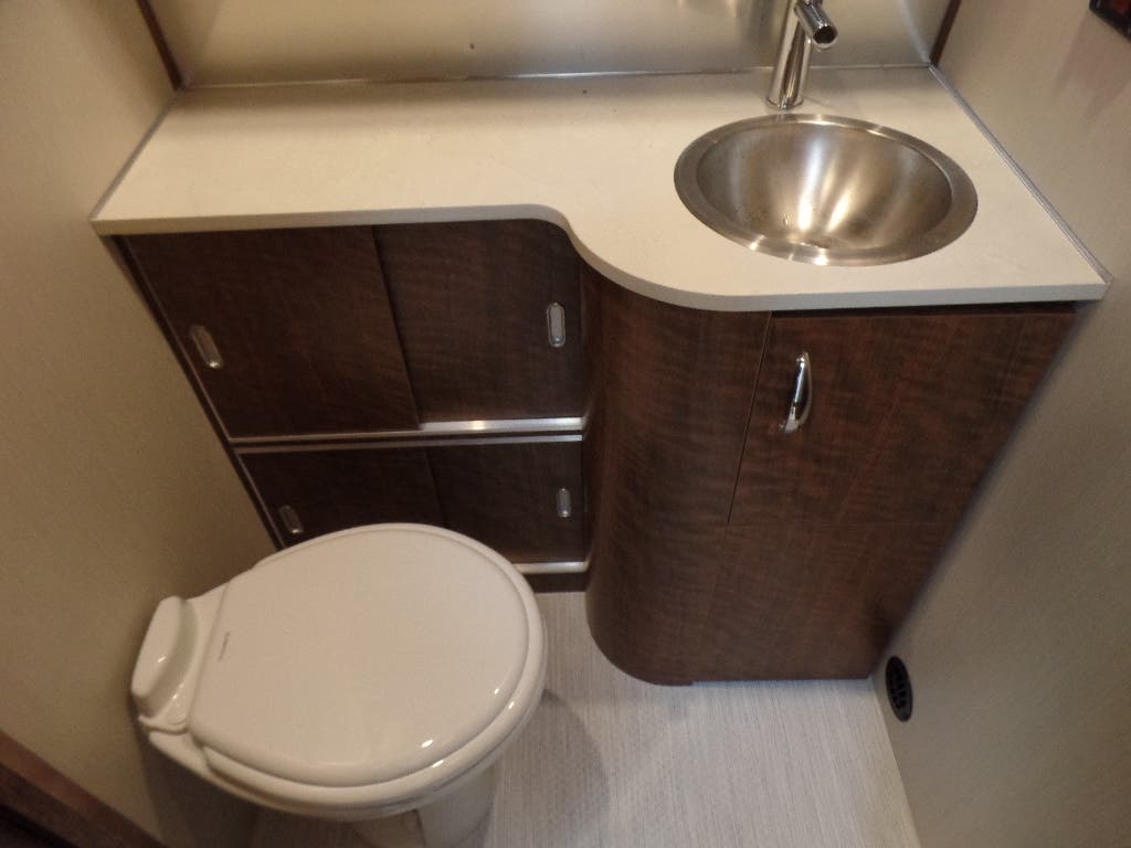 Removable Hand-Held Shower Head with Shut Off, Porcelain Toilet, Lavy Sink, Roof Vent/Fan, Towel Bar/Ring, Retractable Clothes Line in Shower, Grohe Faucet.