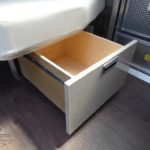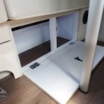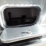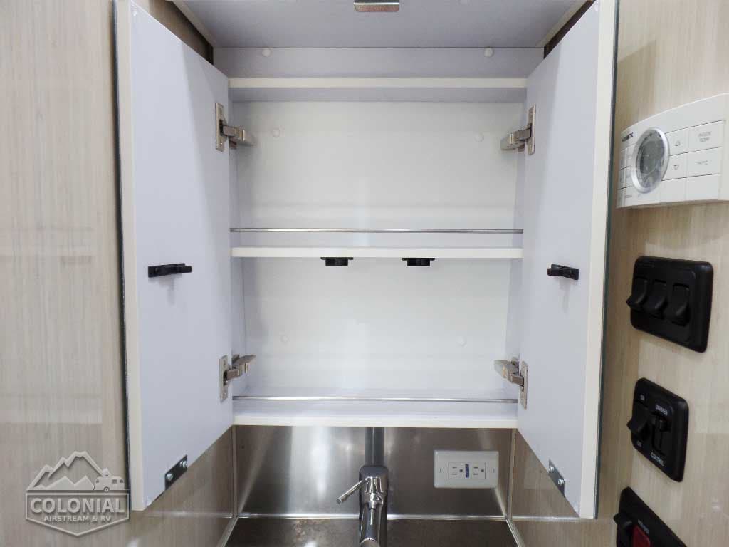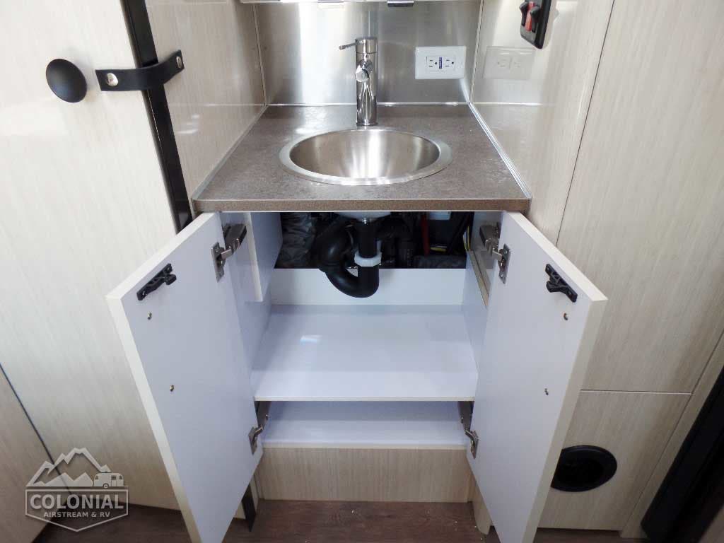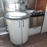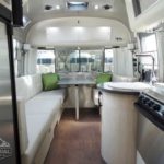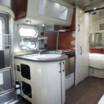 Corian Galley Top • Sink Cover • S.S. Single Round Bowl 18” Chrome Faucet w/Pull-Out • Filtered Cold Water • Brushed Stainless Steel Insert on Refrigerator • Bi-Fold Stainless Steel Range Cover • Overhead Rooflocker w/Slider Doors & LED Accent Lighting 42″ X 76″ Dinette (23CB, 25’FB, 25RB & 27FB) • 39” X 76” Dinette ( 23FB, 28RB & 30RB) • Call Colonial Airstream 18663073857 • Cutlery Drawer w/Hardwood Maple Drawer Organizer.