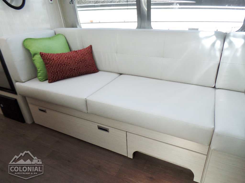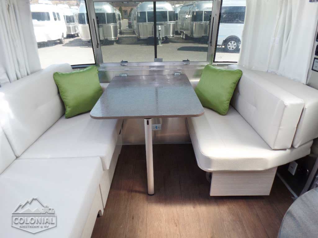 Pull Roller Shades on All Windows Except Drapes on Panoramic Windows • Full Closeout Drapes At Panoramic Windows W/Blackout Linings • Bright Aluminum Finish Interior Skin • Laminate Furniture & Countertops • Wood drawer boxes w/ full extension, self closing ball-bearing drawer glides • Call Colonial Airstream 18663073857 • Overhead Rooflockers w/ Slider Doors & LED Accent Lighting • Entrance Mat w/Airstream Logo • Interior Grab Handle • Vinyl Flooring Throughout • Magazine Rack (N/A 27FB)