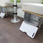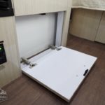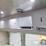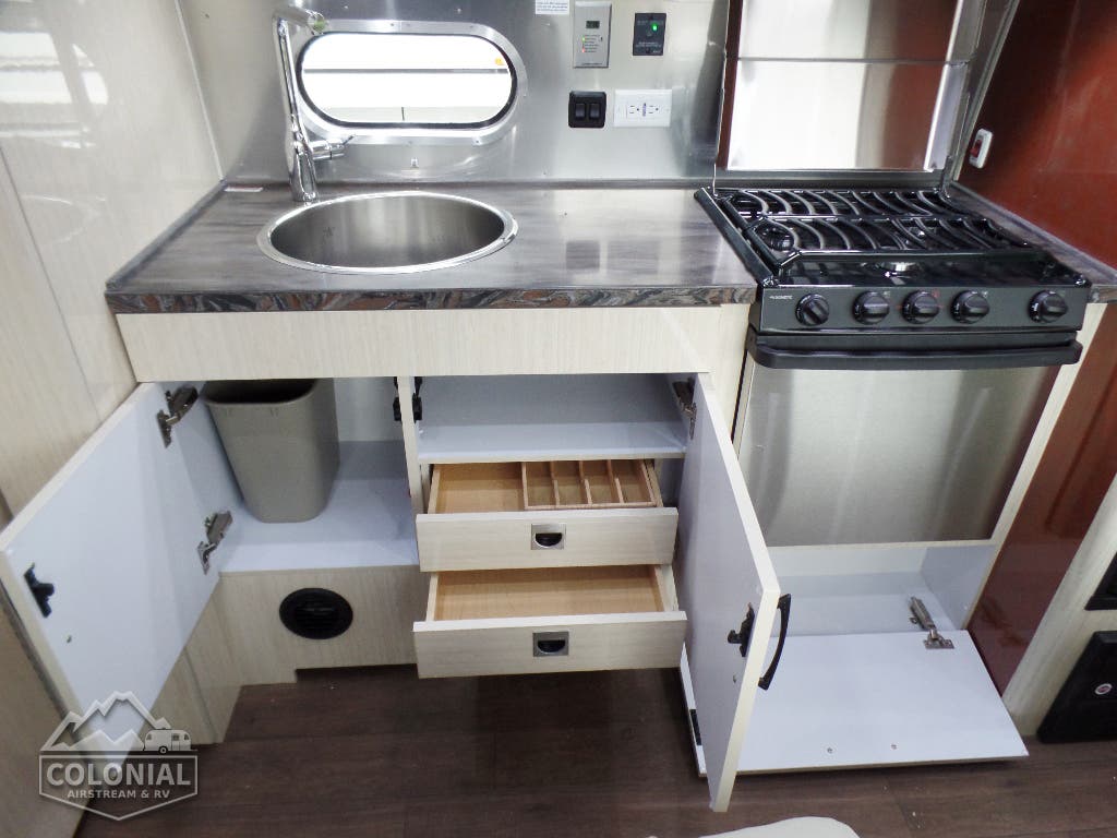 Corian Galley Top • Sink Cover • S.S. Single Round Bowl 18” Chrome Faucet w/Pull-Out • Filtered Cold Water • Brushed Stainless Steel Insert on Refrigerator • Bi-Fold Stainless Steel Range Cover • Overhead Rooflocker w/Slider Doors & LED Accent Lighting 42″ X 76″ Dinette (23CB, 25’FB, 25RB & 27FB) • 39” X 76” Dinette ( 23FB, 28RB & 30RB) • Call Colonial Airstream 18663073857 • Cutlery Drawer w/Hardwood Maple Drawer Organizer.