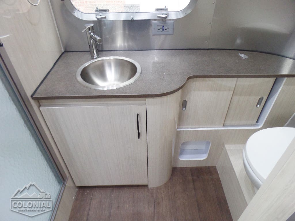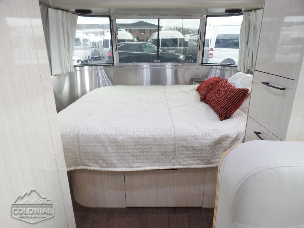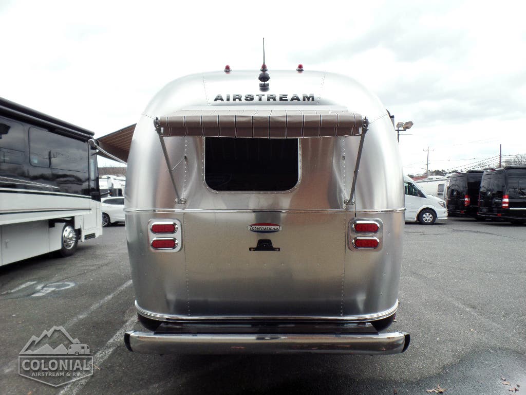 Bright Aluminum Finish – White Aluminum Finish on Roof • Polished Rear Bumper w/Storage • International Medallion w/Chrome Beltline & Rub-rail w/Inserts • CCD Nameplate • Signature Series Logo • License Plate Bracket w/LED Light • Grab Handle -Cast Aluminum• Aluminum LP Bottle Cover • Enclosed/Insulated Underbelly & Tanks • Dark Grey Zip Dee Power Patio Awning C.S.• Call Colonial Airstream 18663073857 • Stainless Steel Wrap Protectors • C.S. & R.S. Awning Rails • Solar Stoneguard • Main Door w/Opaque Window • Diamond Plate Exterior Storage Compartment • Cast Taillights – 6” LED Oval • Exterior LP Service Port w/QuickConnect Hose & Adapter Fitting • Exterior Shower • LED Light Strip on Patio Awning with Dimmer Switch, Roadside & Rear Window Awnings, Wireless Backup/Driving Camera W/Monitor.