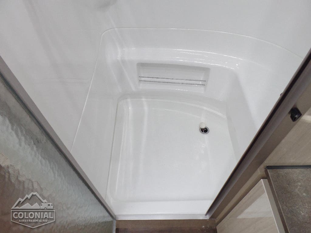 Towel Bar • Towel Ring • Robe Hook • Hinged Bath Door w/Window • Retractable Clothes Line in Shower • Stainless Steel Round Lavy Sink • China Toilet • Call Colonial Airstream 18663073857 • Mirrored Medicine Cabinet (N/A 23FB, 25RB & 30RB) • Articulating Swivel Double-Sided Mirror (23FB, 25RB & 30RB only).