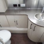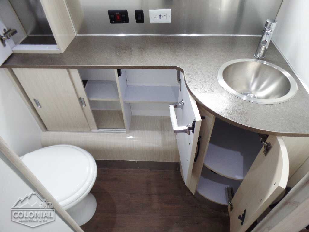 Towel Bar • Towel Ring • Robe Hook • Hinged Bath Door w/Window • Retractable Clothes Line in Shower • Stainless Steel Round Lavy Sink • China Toilet • Call Colonial Airstream 18663073857 • Mirrored Medicine Cabinet (N/A 23FB, 25RB & 30RB) • Articulating Swivel Double-Sided Mirror (23FB, 25RB & 30RB only).