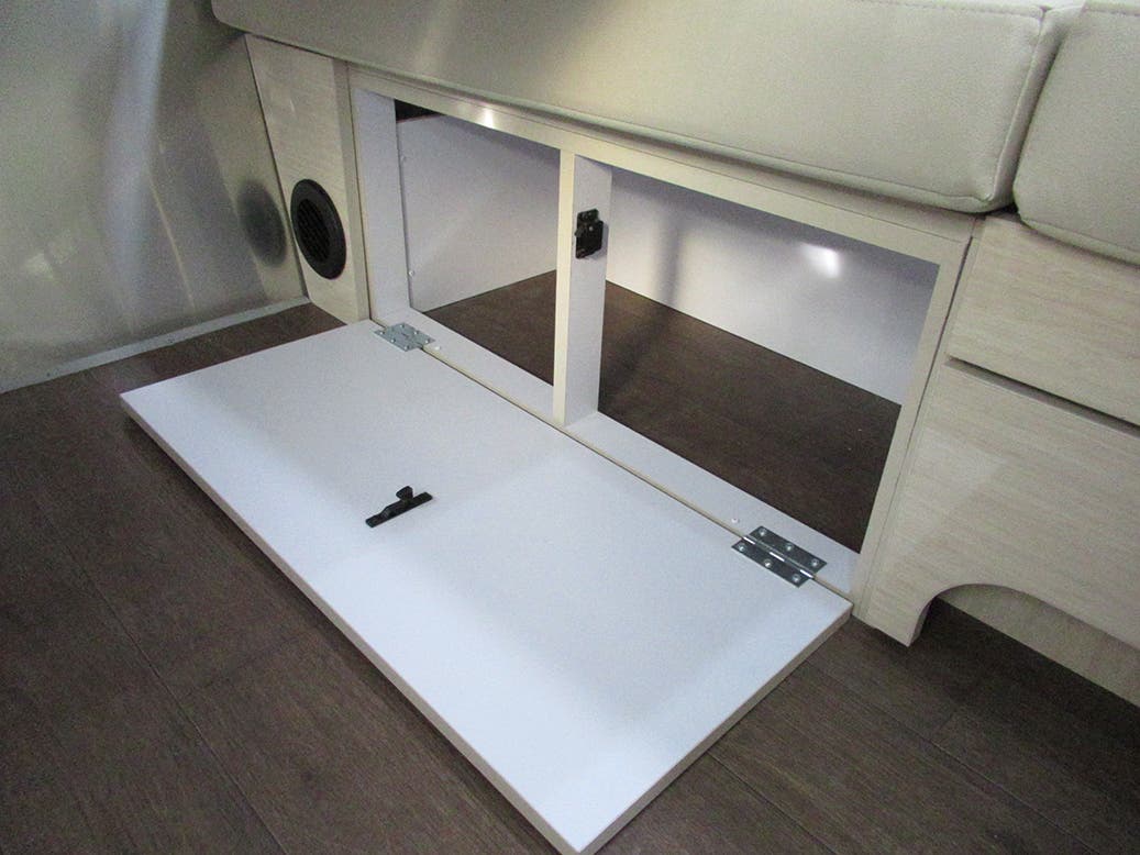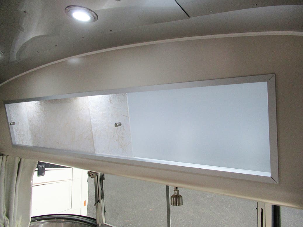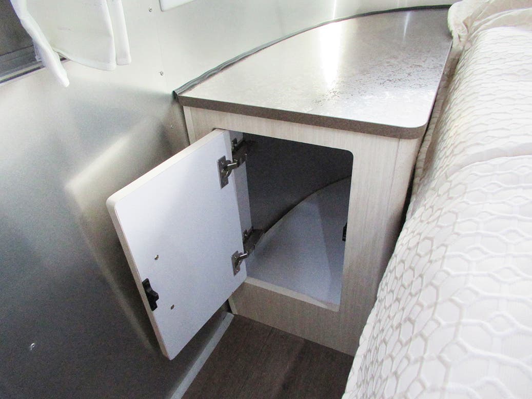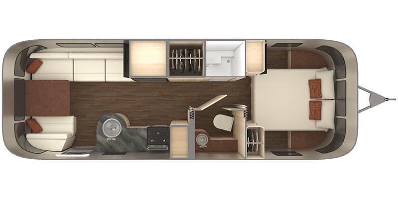 Pull Roller Shades on All Windows Except Drapes on Panoramic Windows • Full Closeout Drapes At Panoramic Windows W/Blackout Linings • Bright Aluminum Finish Interior Skin • Laminate Furniture & Countertops • Wood drawer boxes w/ full extension, self closing ball-bearing drawer glides • Call Colonial Airstream 1-800-265-9019 • Overhead Rooflockers w/ Slider Doors & LED Accent Lighting • Entrance Mat w/Airstream Logo • Interior Grab Handle • Vinyl Flooring Throughout • Magazine Rack (N/A 27FB)