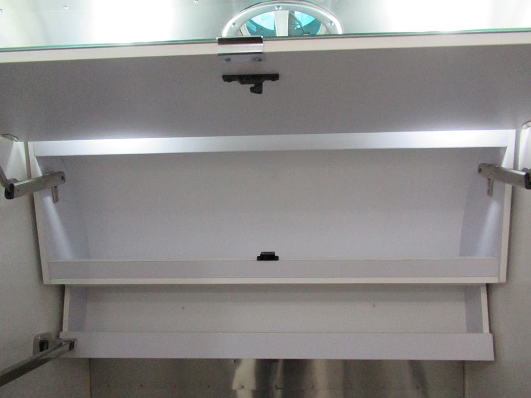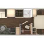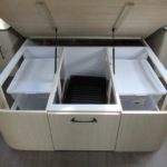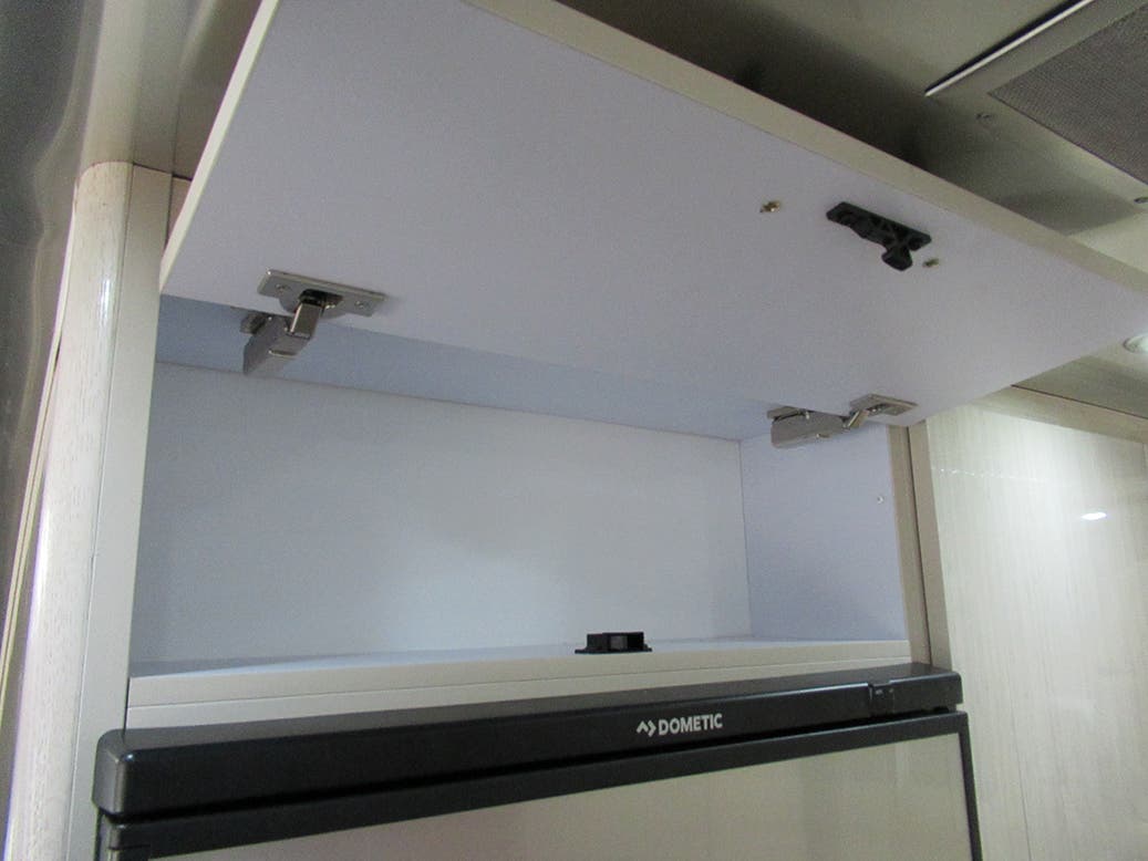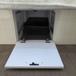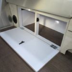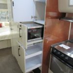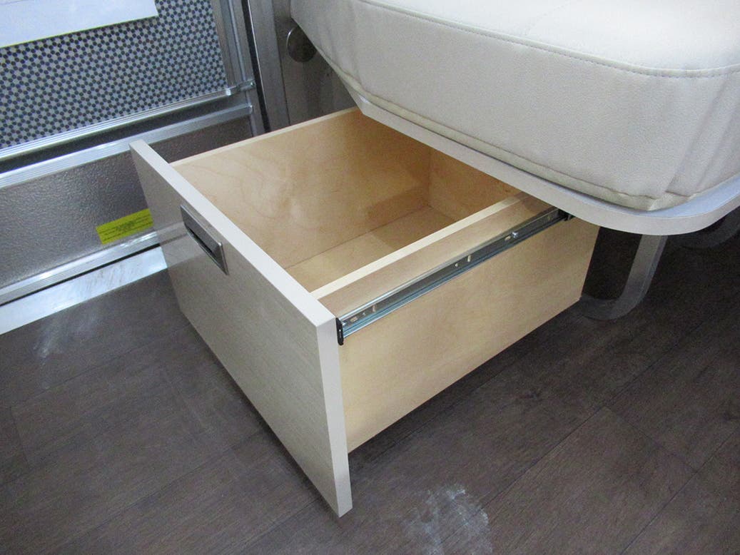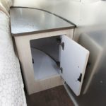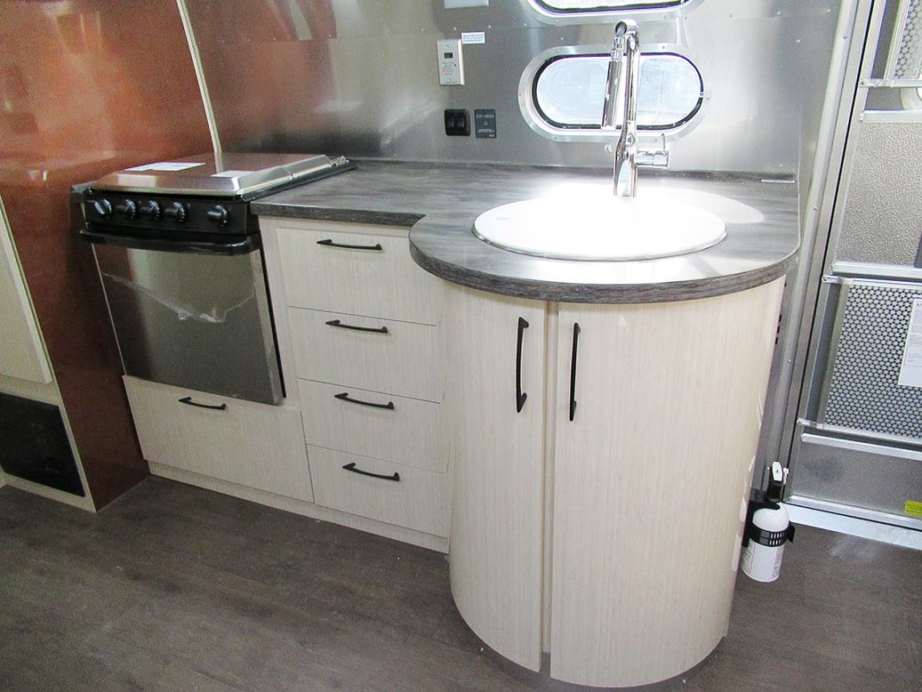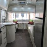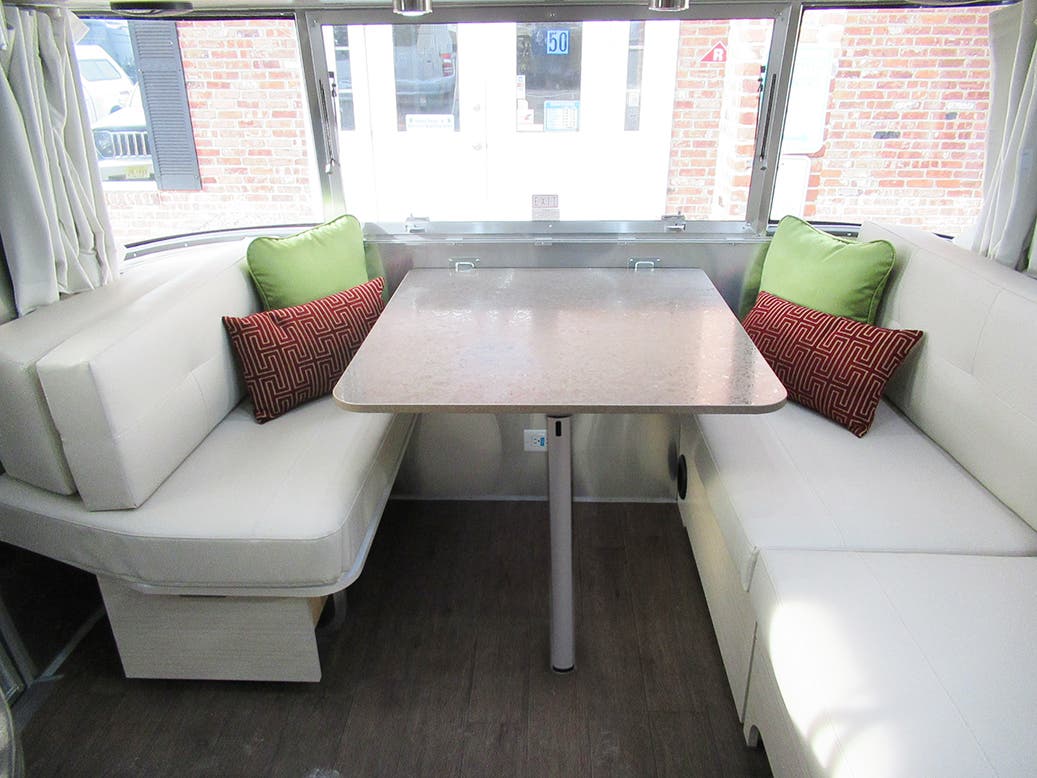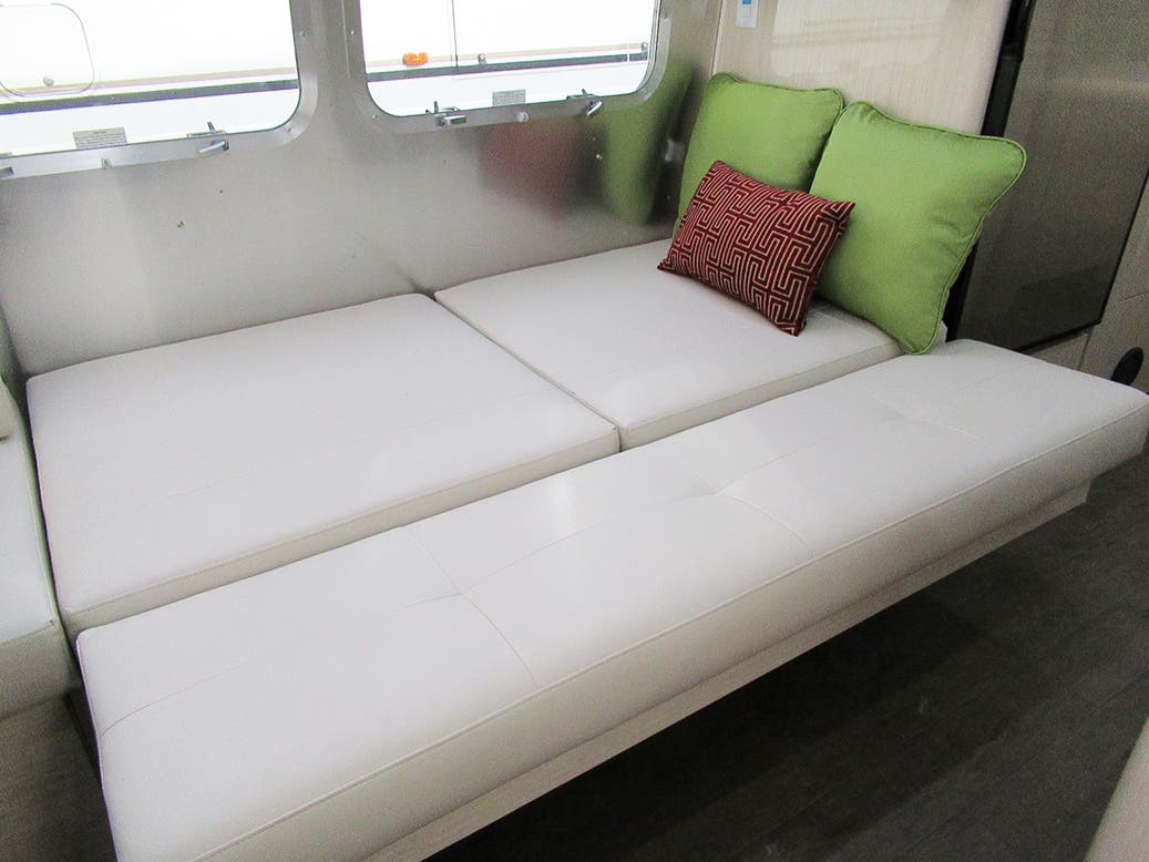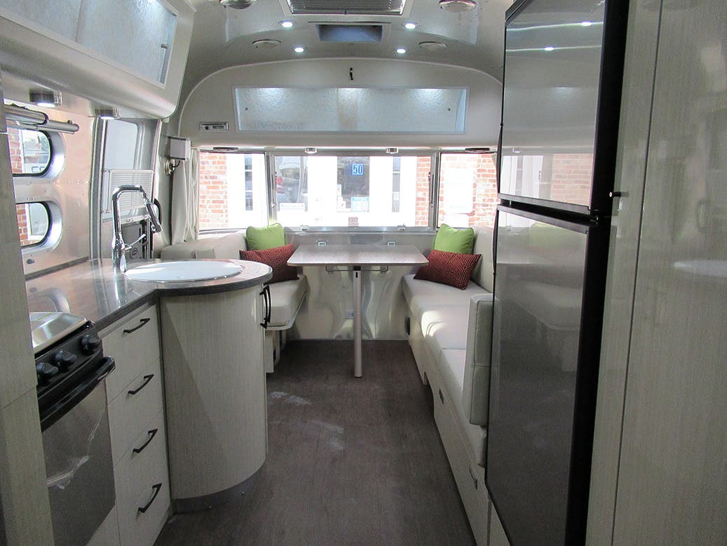 Corian Galley Top • Sink Cover • S.S. Single Round Bowl 18” Chrome Faucet w/Pull-Out • Filtered Cold Water • Brushed Stainless Steel Insert on Refrigerator • Bi-Fold Stainless Steel Range Cover • Overhead Rooflocker w/Slider Doors & LED Accent Lighting 42″ X 76″ Dinette (23CB, 25’FB, 25RB & 27FB) • 39” X 76” Dinette ( 23FB, 28RB & 30RB) • Call Colonial Airstream 1-800-265-9019 • Cutlery Drawer w/Hardwood Maple Drawer Organizer.