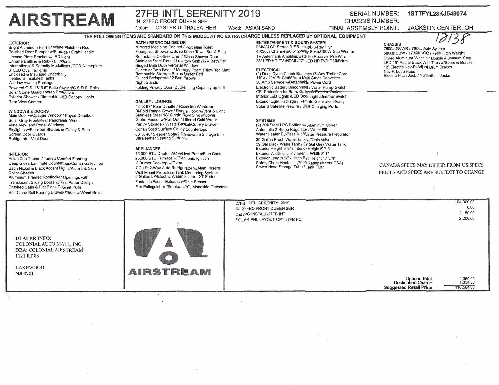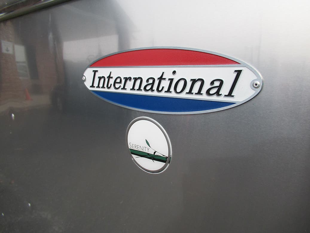 Bright Aluminum Finish – White Aluminum Finish on Roof • Polished Rear Bumper w/Storage • International Medallion w/Chrome Beltline & Rub-rail w/Inserts • CCD Nameplate • Signature Series Logo • License Plate Bracket w/LED Light • Grab Handle -Cast Aluminum• Aluminum LP Bottle Cover • Enclosed/Insulated Underbelly & Tanks • Dark Grey Zip Dee Power Patio Awning C.S.• Call Colonial Airstream 1-800-265-9019 • Stainless Steel Wrap Protectors • C.S. & R.S. Awning Rails • Solar Stoneguard • Main Door w/Opaque Window • Diamond Plate Exterior Storage Compartment • Cast Taillights – 6” LED Oval • Exterior LP Service Port w/QuickConnect Hose & Adapter Fitting • Exterior Shower • LED Light Strip on Patio Awning with Dimmer Switch, Roadside & Rear Window Awnings, Wireless Backup/Driving Camera W/Monitor.