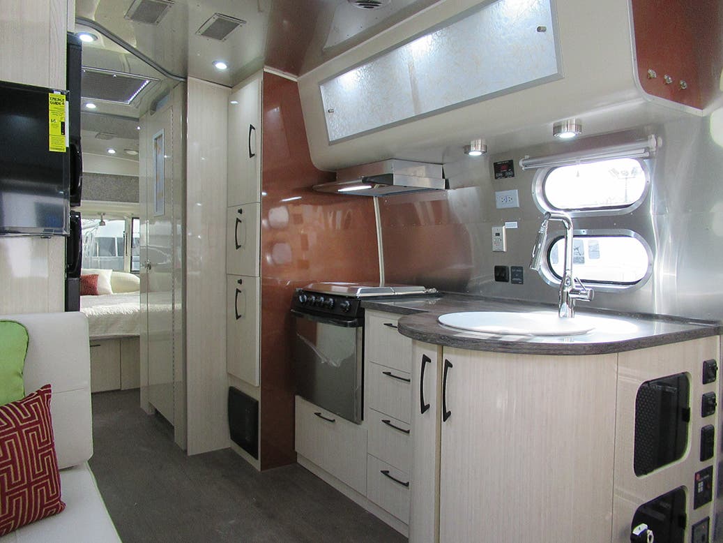 Two Deep Cycle Coach Group 24 Batteries • 7-Way Trailer Cord w/Junction Box • 110volt AC/12volt DC Power Center w/55 amp Converter • 12 volt ATC Fuses • Interior LED Lighting • Directional LED Reading Lights • 120 volt Exterior Outlet • GFCI Protection for Bath, Galley & Exterior Outlet • Exterior LED Lighting Package Includes: Dump Valve, Compartment Area & Door Light • Call Colonial Airstream 1-800-265-9019 • Water Pump Switch at Galley • Solar Prewire W/Roof-Top Plugs & Plug For Portable Solar at Front Trailer A-Frame • Dimmer Switches (2) – Main Ceiling & Bedroom Lights • Electronic Battery Disconnect • 30 amp Service Detachable Power Cord • Remote Generator Ready (25FB, 25RB, 27FB & 28RB) • 3 USB Charge Stations •1000 Watt Inverter.
