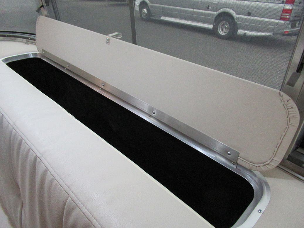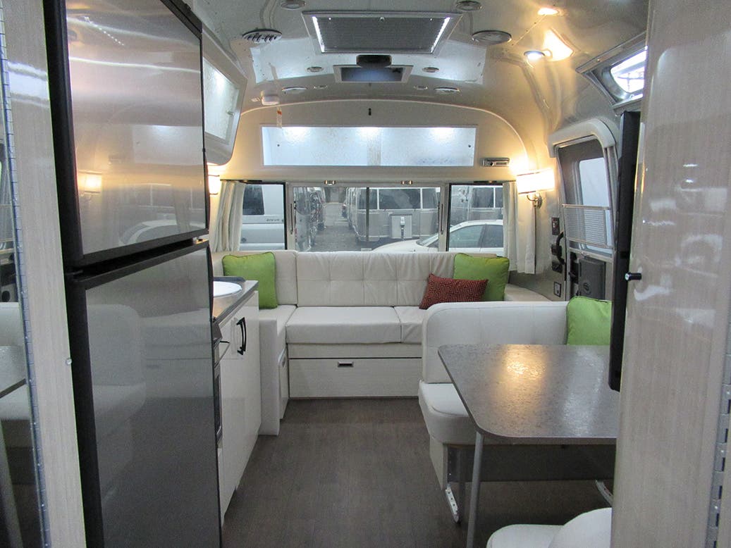 Pull Roller Shades on All Windows Except Drapes on Panoramic Windows • Full Closeout Drapes At Panoramic Windows W/Blackout Linings • Bright Aluminum Finish Interior Skin • Laminate Furniture & Countertops • Wood drawer boxes w/ full extension, self closing ball-bearing drawer glides • Call Colonial Airstream 1-800-265-9019 • Overhead Rooflockers w/ Slider Doors & LED Accent Lighting • Entrance Mat w/Airstream Logo • Interior Grab Handle • Vinyl Flooring Throughout • Magazine Rack (N/A 27FB)