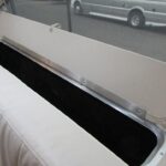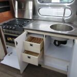 Corian Galley Top • Sink Cover • S.S. Single Round Bowl 18” Chrome Faucet w/Pull-Out • Filtered Cold Water • Brushed Stainless Steel Insert on Refrigerator • Bi-Fold Stainless Steel Range Cover • Overhead Rooflocker w/Slider Doors & LED Accent Lighting 42″ X 76″ Dinette (23CB, 25’FB, 25RB & 27FB) • 39” X 76” Dinette ( 23FB, 28RB & 30RB) • Call Colonial Airstream 1-800-265-9019 • Cutlery Drawer w/Hardwood Maple Drawer Organizer.