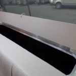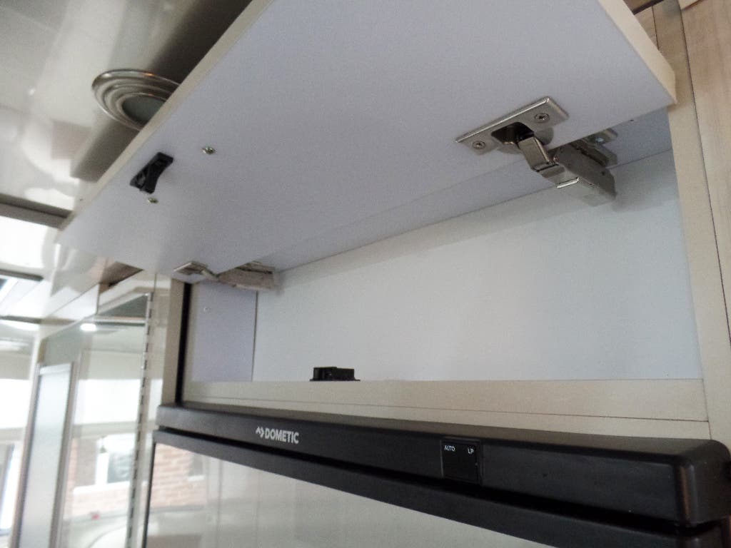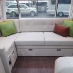Corian Galley Top • Sink Cover • S.S. Single Round Bowl 18” Chrome Faucet w/Pull-Out • Filtered Cold Water • Brushed Stainless Steel Insert on Refrigerator • Bi-Fold Stainless Steel Range Cover • Overhead Rooflocker w/Slider Doors & LED Accent Lighting 42″ X 76″ Dinette (23CB, 25’FB, 25RB & 27FB) • 39” X 76” Dinette ( 23FB, 28RB & 30RB) • Call Colonial Airstream 1-800-265-9019 • Cutlery Drawer w/Hardwood Maple Drawer Organizer.