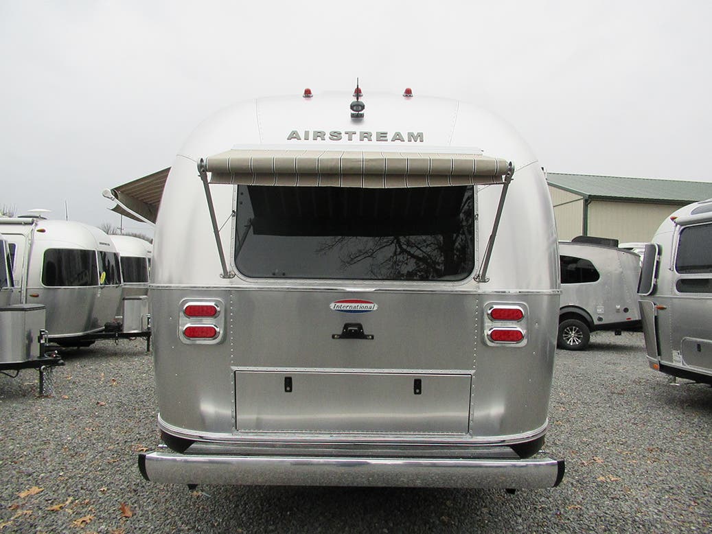 Bright Aluminum Finish – White Aluminum Finish on Roof • Polished Rear Bumper w/Storage • International Medallion w/Chrome Beltline & Rub-rail w/Inserts • CCD Nameplate • Signature Series Logo • License Plate Bracket w/LED Light • Grab Handle -Cast Aluminum• Aluminum LP Bottle Cover • Enclosed/Insulated Underbelly & Tanks • Dark Grey Zip Dee Power Patio Awning C.S.• Call Colonial Airstream 1-800-265-9019 • Stainless Steel Wrap Protectors • C.S. & R.S. Awning Rails • Solar Stoneguard • Main Door w/Opaque Window • Diamond Plate Exterior Storage Compartment • Cast Taillights – 6” LED Oval • Exterior LP Service Port w/QuickConnect Hose & Adapter Fitting • Exterior Shower • LED Light Strip on Patio Awning with Dimmer Switch, Roadside & Rear Window Awnings, Wireless Backup/Driving Camera W/Monitor.