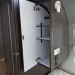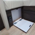 Corain Galley Top • Laminate Table Top • Sink Cover • Stainless Steel Single Round Bowl 18? Sink (Rectangular Bowl 15.75? on 19′) • Chrome Faucets w/Pull Out • Filtered Cold Water • Brushed Stainless Steel Insert on Refrigerator • Bi-Fold Stainless Steel Range Cover • Overhead Roof Locker w/Slider Doors • 42”x76” Dinette (23CB, 25′ & 27′) • 39? x 76? Dinette (23FB, 28′ & 30′) • Cutlery Drawer w/Hardwood Maple Drawer Organizer • Bi-Fold Range Cover.