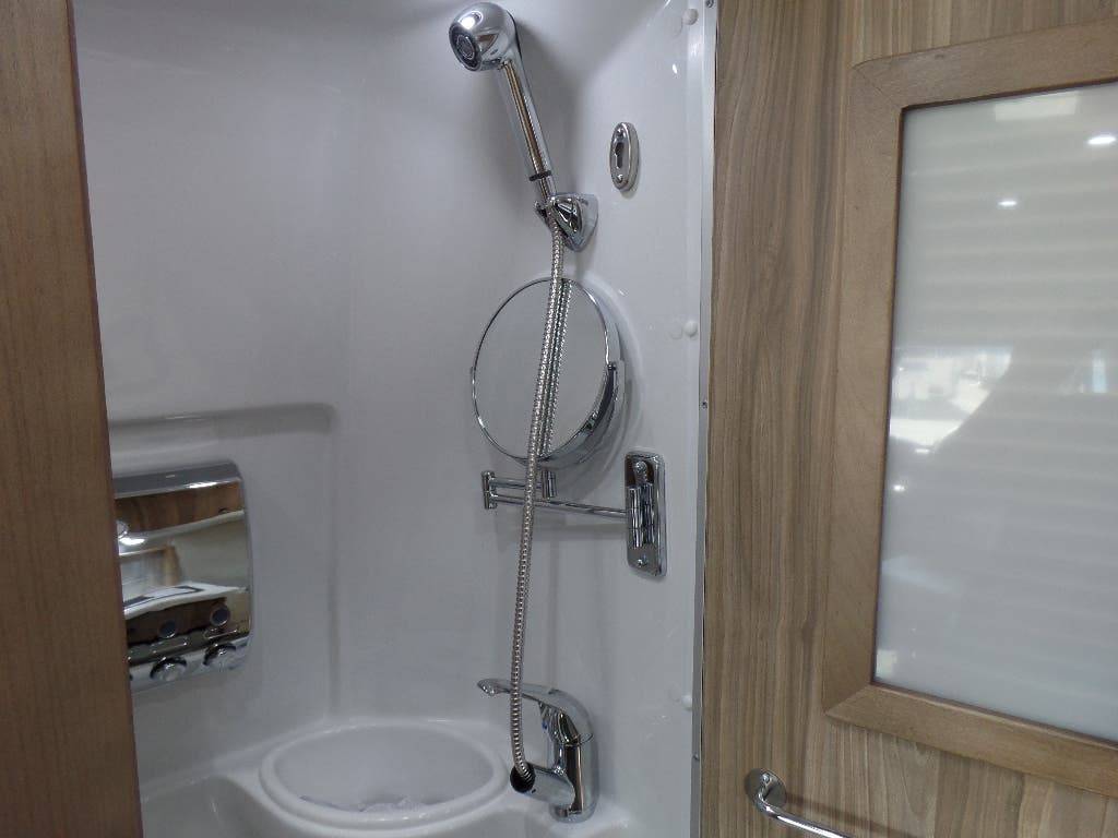 Wet Bath with Shower Curtain • Call Colonial RV For the Best Price 800 265-9019 • Toilet Residential Style, Larger Size, 360 Triple Jet Flow Rise • LED Shower Lights (2) • Toilet Paper Holder • Towel Bar • Lavatory • Retractable Clothes Line • Mirror • Bath Exhaust Fan.