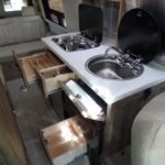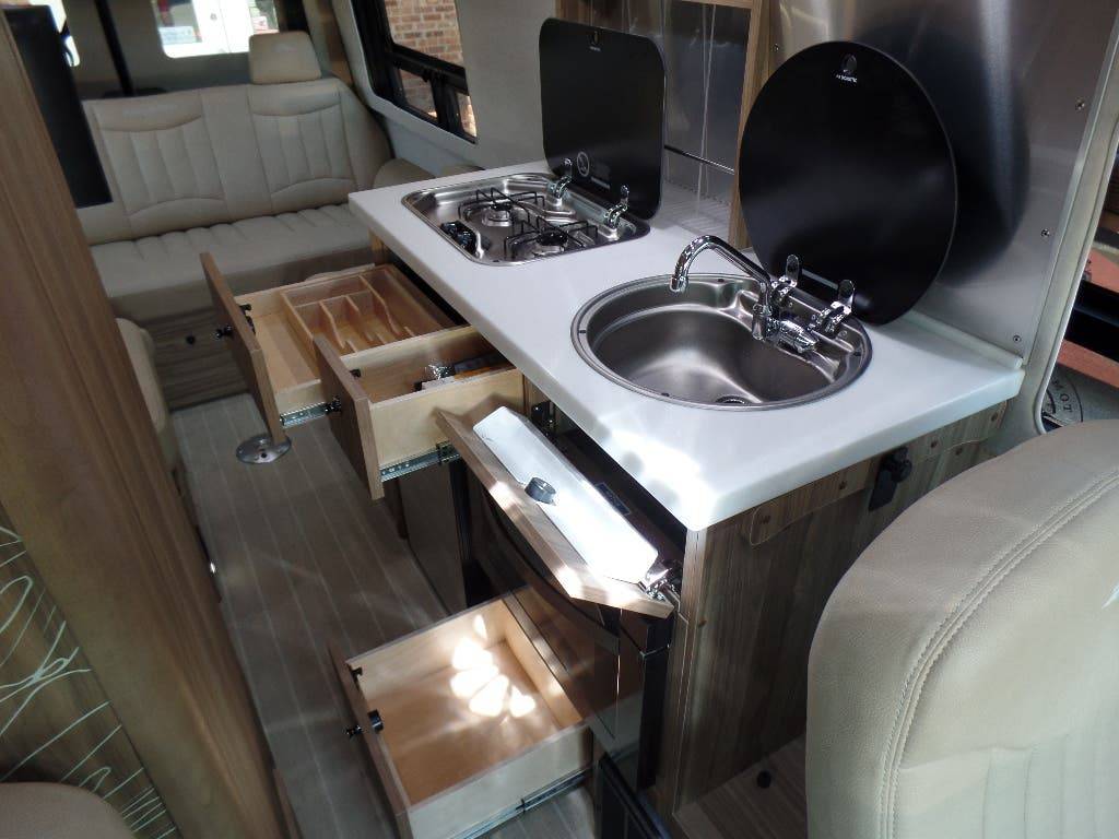 Corian© Countertop w/Backsplash • Sink w/Integrated Cover & Fold Down Faucet • Cutlery Drawer • Welt Trim Around Window Opening On Valances.