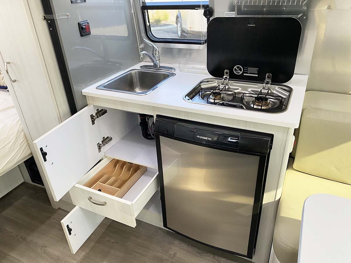 Laminated Galley Top • Aluminum Inserts on Refrigerator • Galley Overhead Rooflocker w/Tambour Doors • Full Height Road Side Storage Cabinet • Fixed Dinette 40” X 74” (16RB); U-Dinette 74.5″ X 38” (22FB) • Colonial Airstream • Stainless Steel Sink w/Cover • Decorative Throw Pillows • Cutlery Drawer w/Hardwood Maple Drawer Organizer • Stainless Steel Galley Sink (Double on 22FB) With Separate Faucet and Cover • Front Panoramic Black Out Curtains.