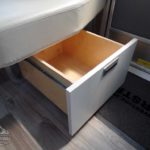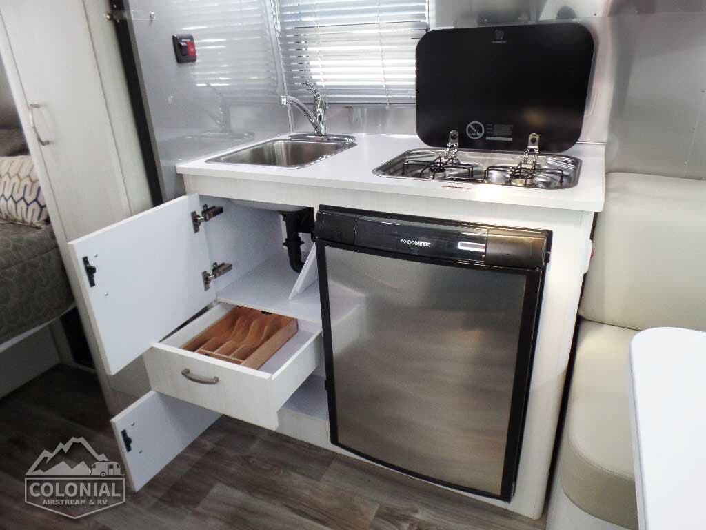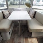 Laminated Galley Top • Aluminum Inserts on Refrigerator • Galley Overhead Rooflocker w/Tambour Doors • Full Height Road Side Storage Cabinet • Fixed Dinette 40” X 74” (16RB); U-Dinette 74.5″ X 38” (22FB) • Colonial Airstream • Stainless Steel Sink w/Cover • Decorative Throw Pillows • Cutlery Drawer w/Hardwood Maple Drawer Organizer • Stainless Steel Galley Sink (Double on 22FB) With Separate Faucet and Cover • Front Panoramic Black Out Curtains.
