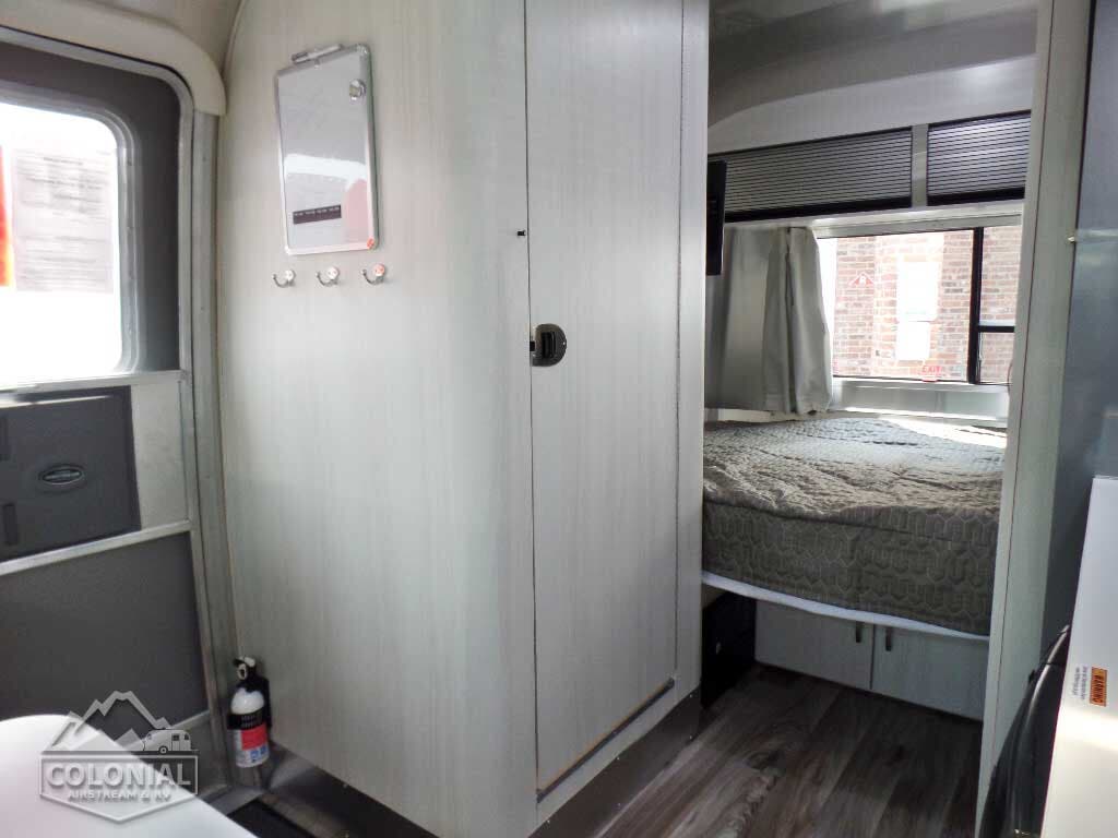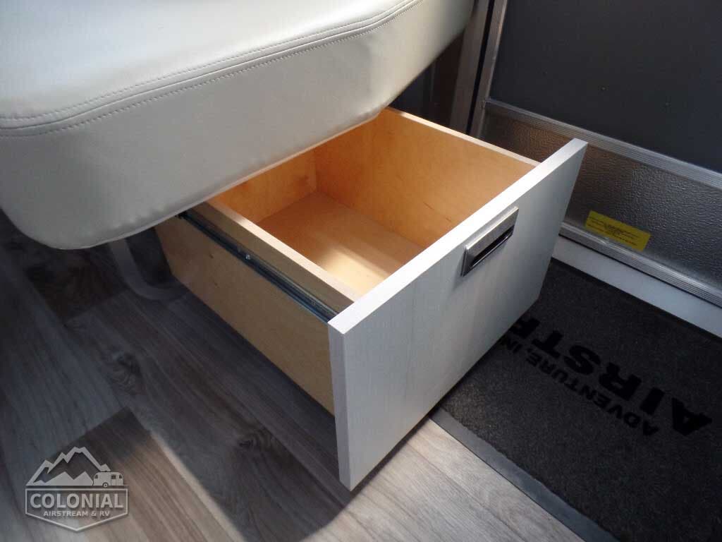 Brushed Aluminum Mini Blinds • Full Close-Out Drapes at Panoramic & Bedroom Windows • Laminate Furniture & Countertops • Bright Aluminum Finish Interior Skin • Seamless Vinyl Flooring Throughout • Colonial Airstream • Overhead Roof Lockers w/Tambour Doors • Interior Grab Handle • Entrance Mat w/ Airstream Logo • Coat Hooks • Information Board • LED Lighting • Ultraleather Seating.
