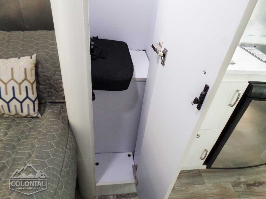 Pillow Top Memory Foam Mattress • Quilted Bedspread w/Reverse Sham, Decorative Throw Pillows & 2 Regular Bed Pillows • Overhead Roof Locker at Bedroom w/Tambour Doors • Colonial Airstream • Removable Under Bed Storage Bins • Sleeping Capacity: 2 – 3 (16RB); 2 – 4 (22FB) • Lift-Up Storage Access Under Bed (22FB).