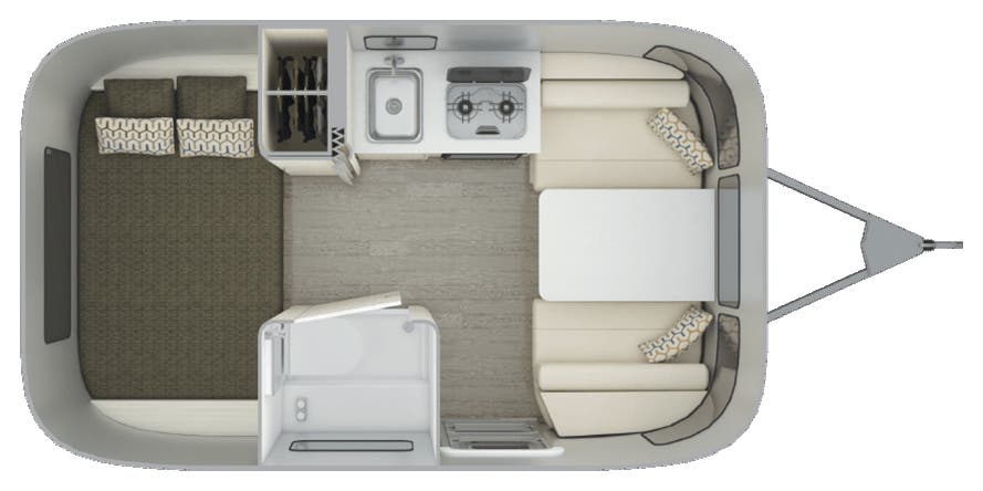 GALLEY DECOR Laminated Galley Top • Aluminum Inserts on Refrigerator • Galley Overhead Rooflocker w/Tambour Doors • Full Height Road Side Storage Cabinet • Fixed Dinette 40” X 74” (16RB); U-Dinette 74.5? X 38” (22FB) • Colonial Airstream • Stainless Steel Sink w/Cover • Decorative Throw Pillows • Cutlery Drawer w/Hardwood Maple Drawer Organizer • Stainless Steel Galley Sink (Double on 22FB) With Separate Faucet and Cover • Front Panoramic Black Out Curtains.