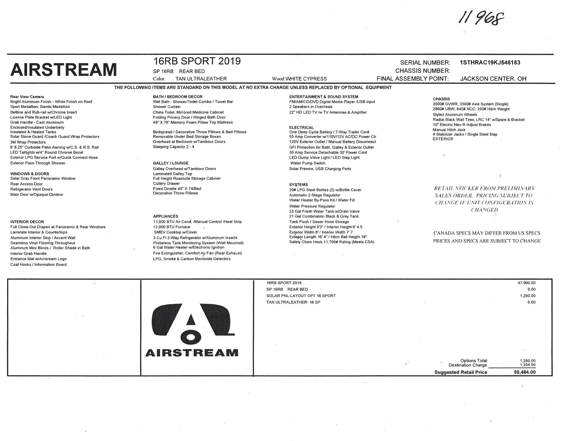 EXTERIOR Bright Aluminum Finish – White Aluminum Finish on Roof • Sport Medallion • Bambi Medallion • Chrome Beltline & Rub-Rail Inserts • License Plate Bracket w/Light • Grab Handle – Cast Aluminum • Enclosed & Insulated Underbelly & Tanks • Colonial Airstream • C.S. & R.S. Awning Rails • Light Grey C.S. Patio Awning • Main Door • 3 pc. Solar Stone Guard • Coach Guard Wrap Protectors • Aluminum LP Bottle Cover • LED Taillights w/Chrome Bezel – 4” Round • Exterior Shower • Exterior LP Service Port w/Quick Connect Hose & Adapter Fitting • Roof mounted “plug & play” solar pre-wire • Portable Solar Plug- Mounted on A-frame • Wireless Backup/Driving Camera System W/Monitor.