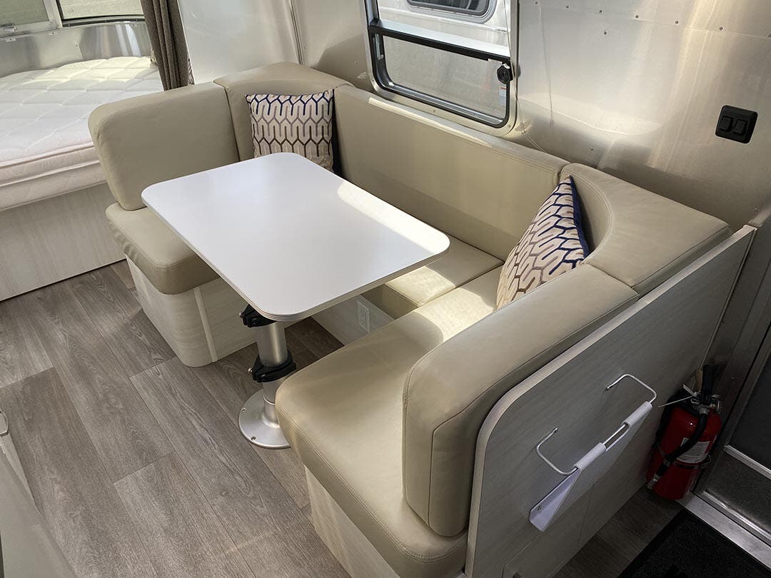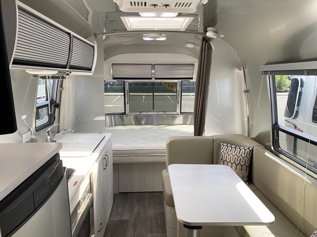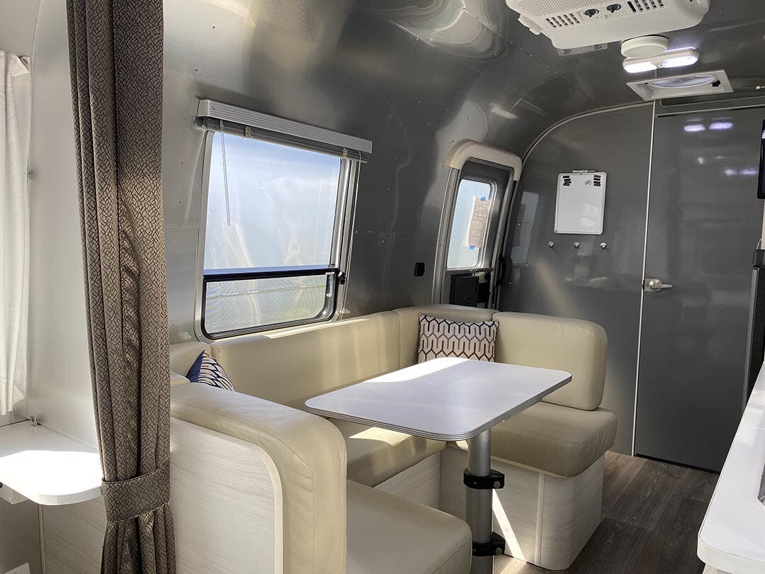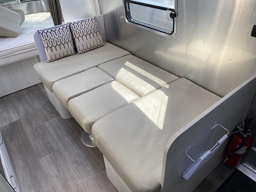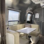 Brushed Aluminum Mini Blinds • Full Close-Out Drapes at Panoramic & Bedroom Windows • Laminate Furniture & Countertops • Bright Aluminum Finish Interior Skin • Seamless Vinyl Flooring Throughout • Colonial Airstream • Overhead Roof Lockers w/Tambour Doors • Interior Grab Handle • Entrance Mat w/ Airstream Logo • Coat Hooks • Information Board • LED Lighting • Ultraleather Seating.