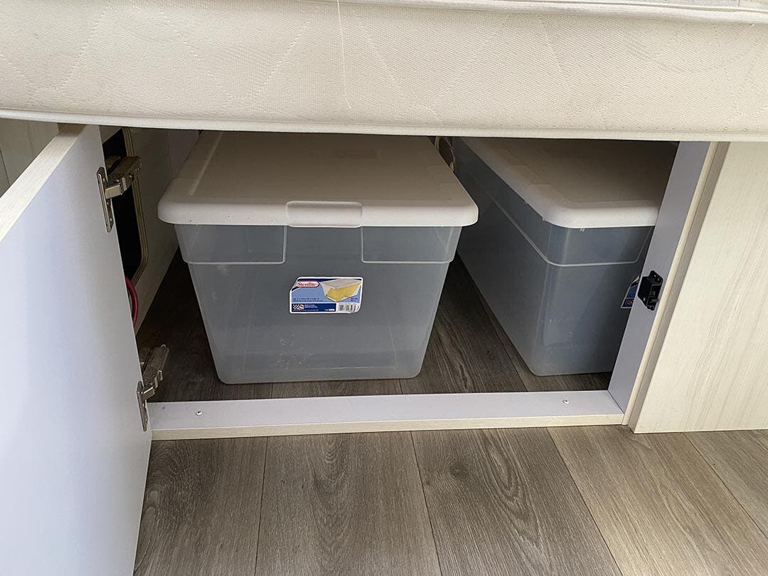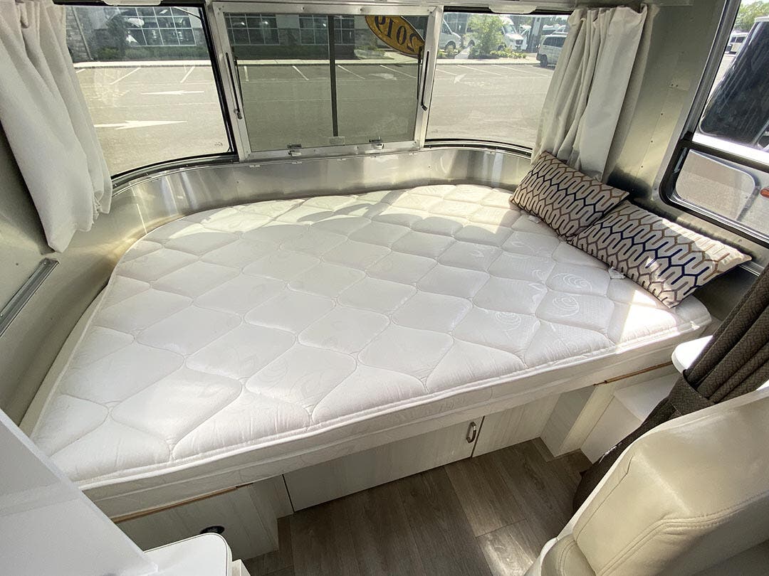 Pillow Top Memory Foam Mattress • Quilted Bedspread w/Reverse Sham, Decorative Throw Pillows & 2 Regular Bed Pillows • Overhead Roof Locker at Bedroom w/Tambour Doors • Colonial Airstream • Removable Under Bed Storage Bins • Sleeping Capacity: 2 – 3 (16RB); 2 – 4 (22FB) • Lift-Up Storage Access Under Bed (22FB).