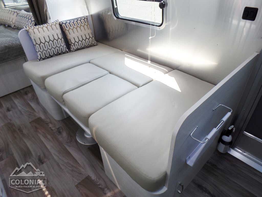 Brushed Aluminum Mini Blinds • Full Close-Out Drapes at Panoramic & Bedroom Windows • Laminate Furniture & Countertops • Bright Aluminum Finish Interior Skin • Seamless Vinyl Flooring Throughout • Colonial Airstream • Overhead Roof Lockers w/Tambour Doors • Interior Grab Handle • Entrance Mat w/ Airstream Logo • Coat Hooks • Information Board • LED Lighting • Ultraleather Seating.