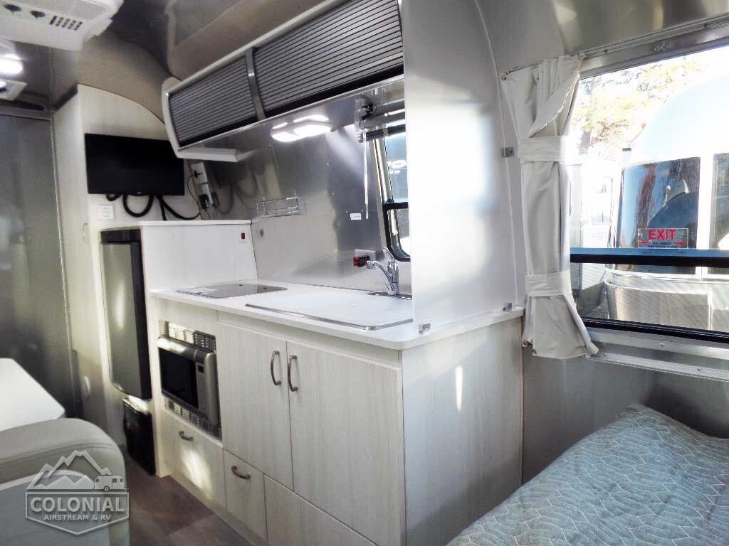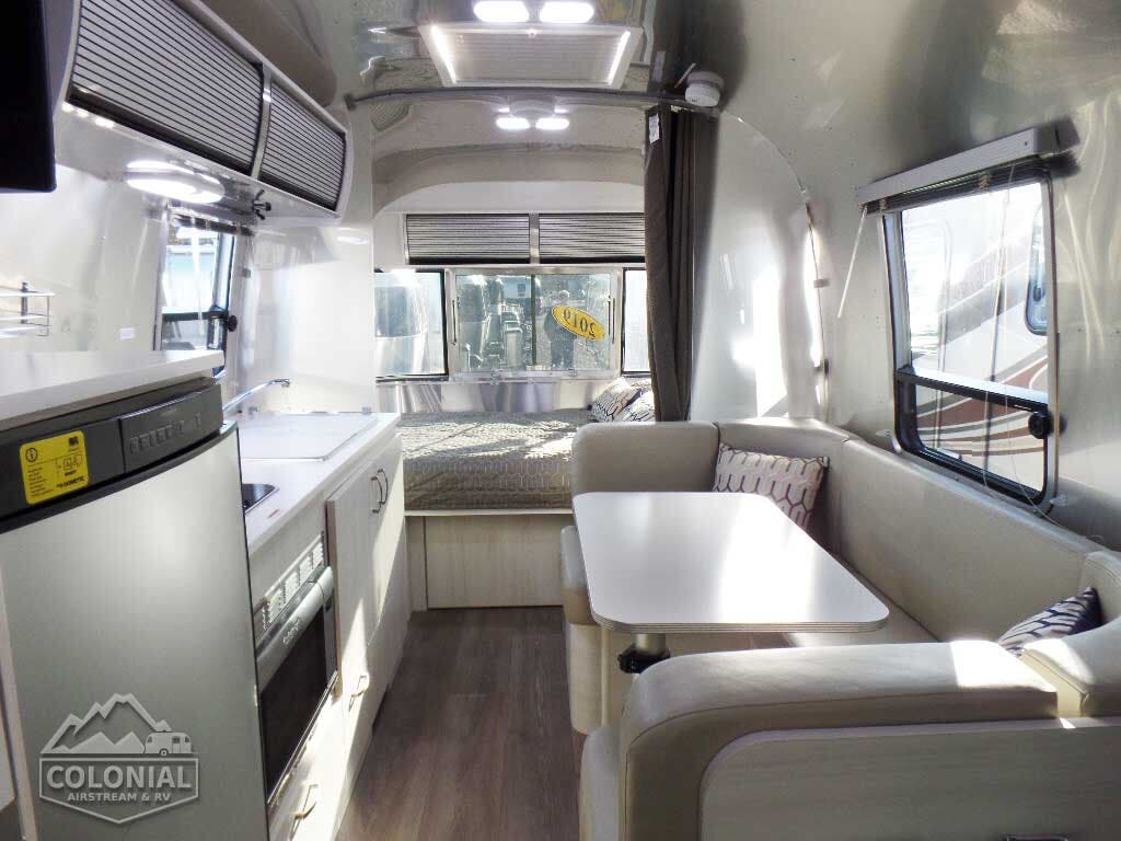 Brushed Aluminum Mini Blinds • Full Close-Out Drapes at Panoramic & Bedroom Windows • Laminate Furniture & Countertops • Bright Aluminum Finish Interior Skin • Seamless Vinyl Flooring Throughout • Colonial Airstream • Overhead Roof Lockers w/Tambour Doors • Interior Grab Handle • Entrance Mat w/ Airstream Logo • Coat Hooks • Information Board • LED Lighting • Ultraleather Seating.
