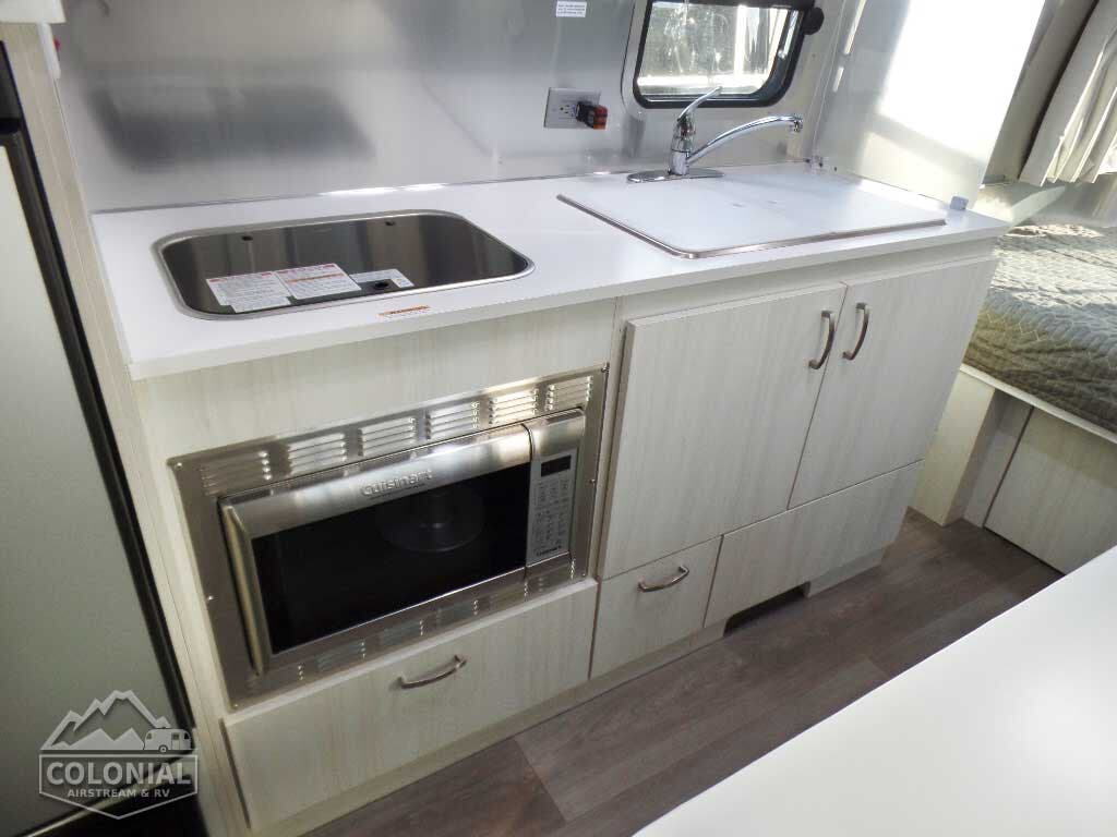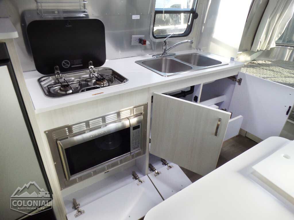 Laminated Galley Top • Aluminum Inserts on Refrigerator • Galley Overhead Rooflocker w/Tambour Doors • Full Height Road Side Storage Cabinet • Fixed Dinette 40” X 74” (16RB); U-Dinette 74.5″ X 38” (22FB) • Colonial Airstream • Stainless Steel Sink w/Cover • Decorative Throw Pillows • Cutlery Drawer w/Hardwood Maple Drawer Organizer • Stainless Steel Galley Sink (Double on 22FB) With Separate Faucet and Cover • Front Panoramic Black Out Curtains.