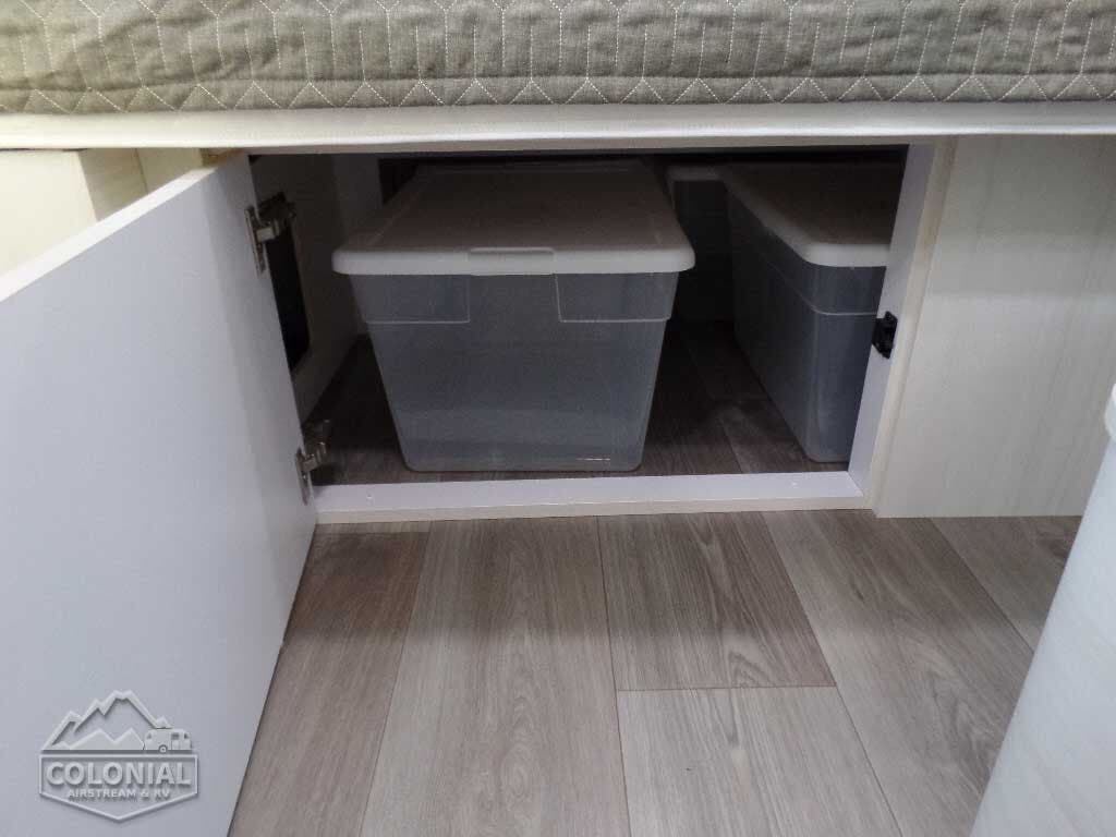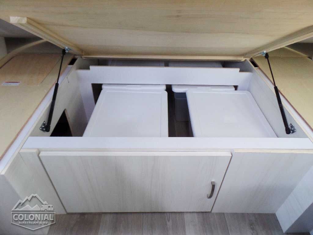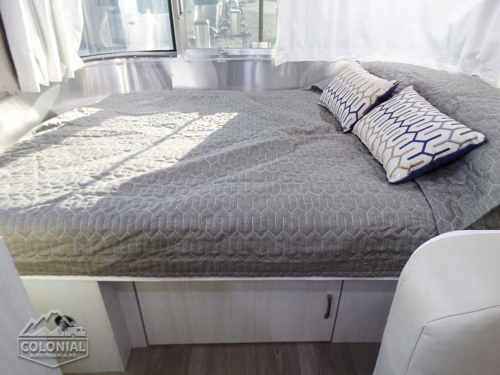 Pillow Top Memory Foam Mattress • Quilted Bedspread w/Reverse Sham, Decorative Throw Pillows & 2 Regular Bed Pillows • Overhead Roof Locker at Bedroom w/Tambour Doors • Colonial Airstream • Removable Under Bed Storage Bins • Sleeping Capacity: 2 – 3 (16RB); 2 – 4 (22FB) • Lift-Up Storage Access Under Bed (22FB).