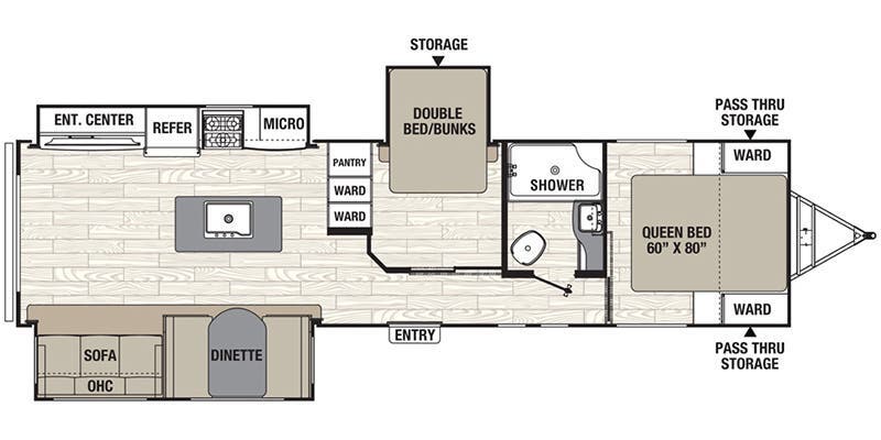 ¾ Gel Coated Fiberglass Front Cap with LED Lights • Aluminum Wheels • Spare Tire Kit • Detachable Power Cord • Electric Power Awning w/ LED Light Strip • Magnetic Catches Compartment Doors • Tinted Safety Glass Windows • Front Diamond Plate • TV & Radio Antenna with Booster • E-Z Lube Axles • Spread Axle Design* • 13,500 BTU Roof Air Conditioner • Heated Enclosed Underbelly* • Solar Port • XL Folding Entry Assist Handle • Exterior Shower Station • Winterize Ready Kit • Black Tank Flush • 2 Exterior Speakers, 4 Interior Speakers • Ducted Furnace* • Ducted Ceiling Air Conditioning* • AM/FM/CD/DVD/Bluetooth Receiver • LED TV • Satellite Ready • LED Interior Lighting • Night Shades • Congoleum Designer Carefree Flooring • Mortise and Tenon Cabinet Doors • Stonecast Sink • Sink Covers • Microwave • Oven with Glass Top 3 Burner Cooktop • 6 Cu. Ft. Two Door Refrigerator • Silverware Drawer** • 60” x 80” Queen Bed • Skylight in Bath • 12” LED Step Light • LED Light Strip in Pass-through Storage • 24” x 48” Resin Outdoor Table • USB Ports in Master & Bunk Rooms • Porcelain Foot Flush Toilet • Backup Camera Prep • Battery Quick Disconnect •RVIA Seal