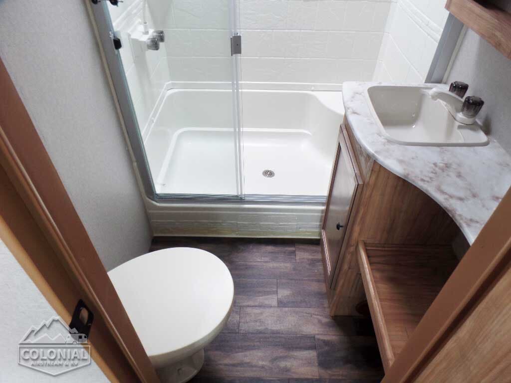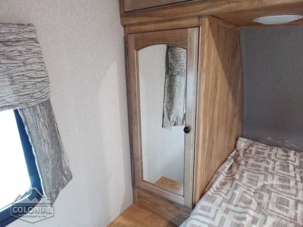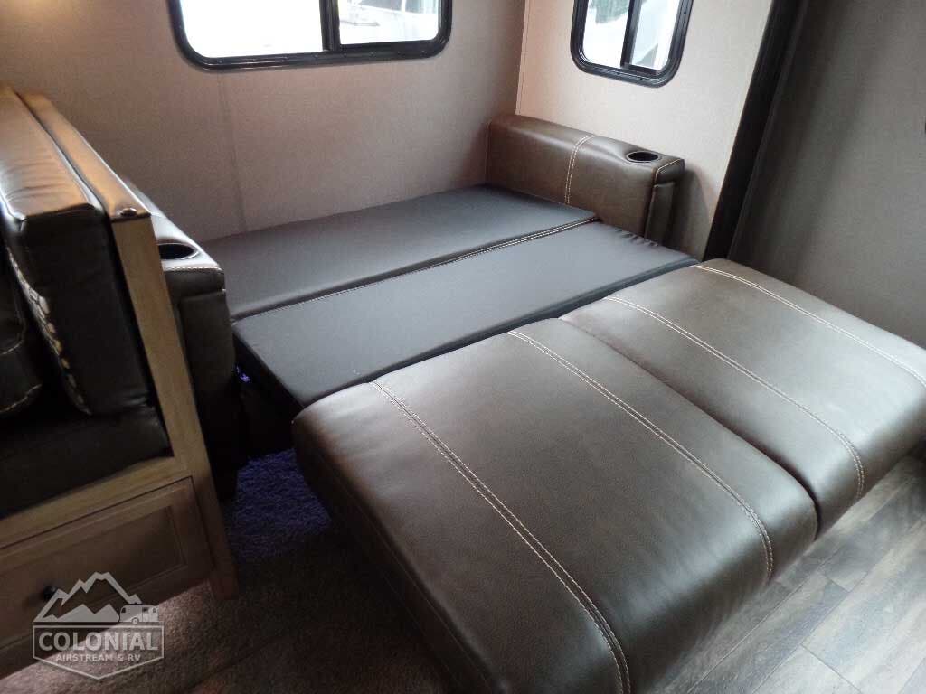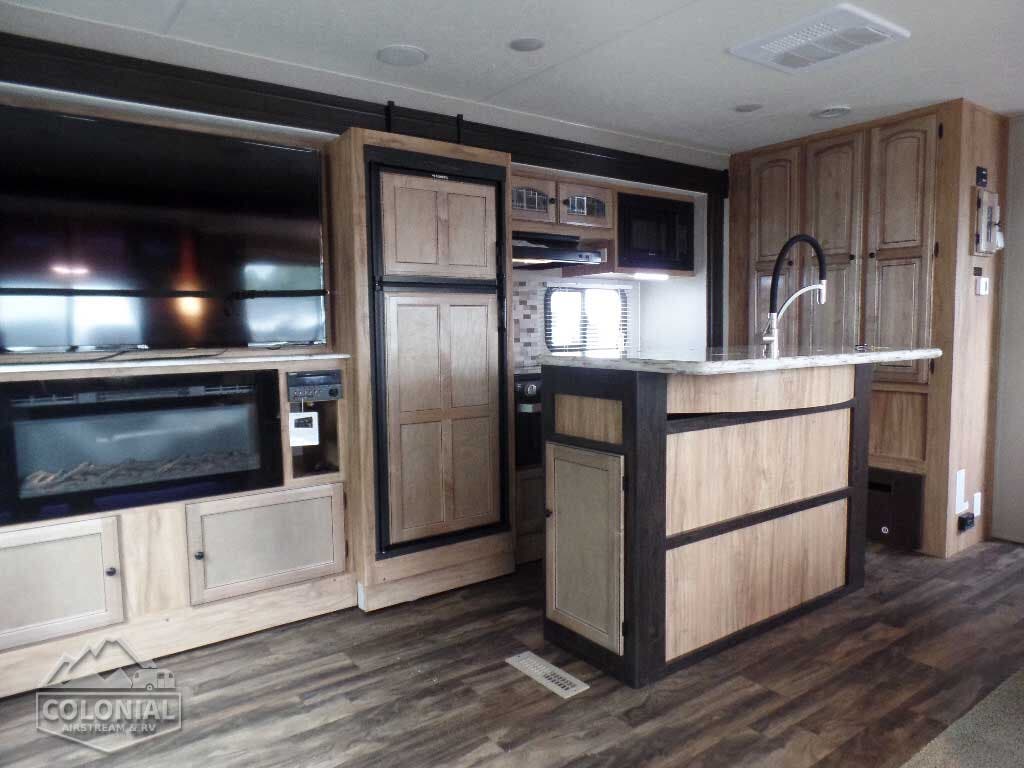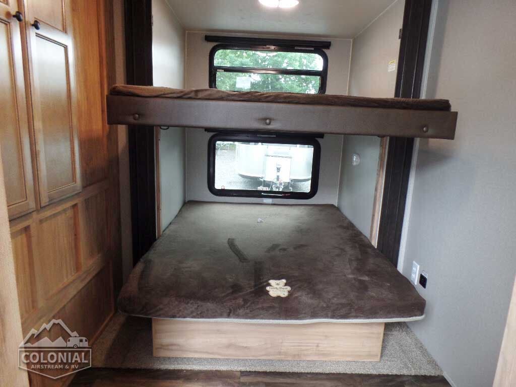 ¾ Gel Coated Fiberglass Front Cap with LED Lights • Aluminum Wheels • Spare Tire Kit • Detachable Power Cord • Electric Power Awning w/ LED Light Strip • Magnetic Catches Compartment Doors • Tinted Safety Glass Windows • Front Diamond Plate • TV & Radio Antenna with Booster • E-Z Lube Axles • Spread Axle Design* • 13,500 BTU Roof Air Conditioner • Heated Enclosed Underbelly* • Solar Port • XL Folding Entry Assist Handle • Exterior Shower Station • Winterize Ready Kit • Black Tank Flush • 2 Exterior Speakers, 4 Interior Speakers • Ducted Furnace* • Ducted Ceiling Air Conditioning* • AM/FM/CD/DVD/Bluetooth Receiver • LED TV • Satellite Ready • LED Interior Lighting • Night Shades • Congoleum Designer Carefree Flooring • Mortise and Tenon Cabinet Doors • Stonecast Sink • Sink Covers • Microwave • Oven with Glass Top 3 Burner Cooktop • 6 Cu. Ft. Two Door Refrigerator • Silverware Drawer** • 60” x 80” Queen Bed • Skylight in Bath • 12” LED Step Light • LED Light Strip in Pass-through Storage • 24” x 48” Resin Outdoor Table • USB Ports in Master & Bunk Rooms • Porcelain Foot Flush Toilet • Backup Camera Prep • Battery Quick Disconnect •RVIA Seal