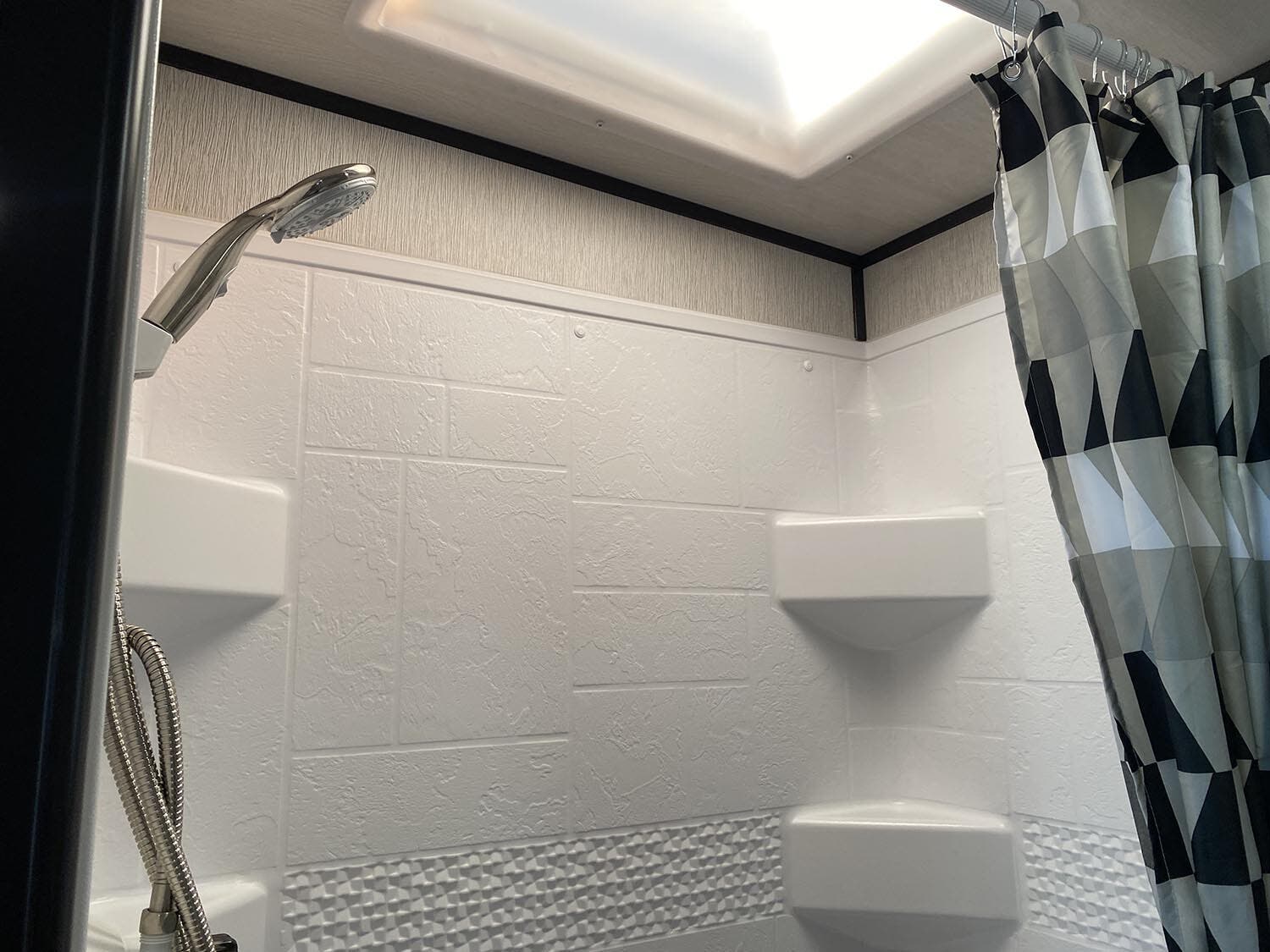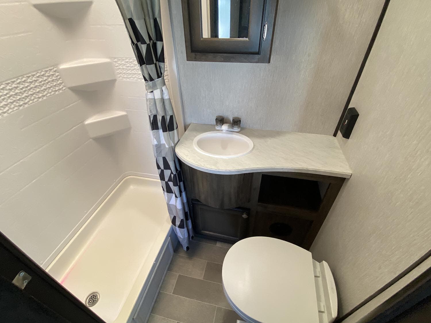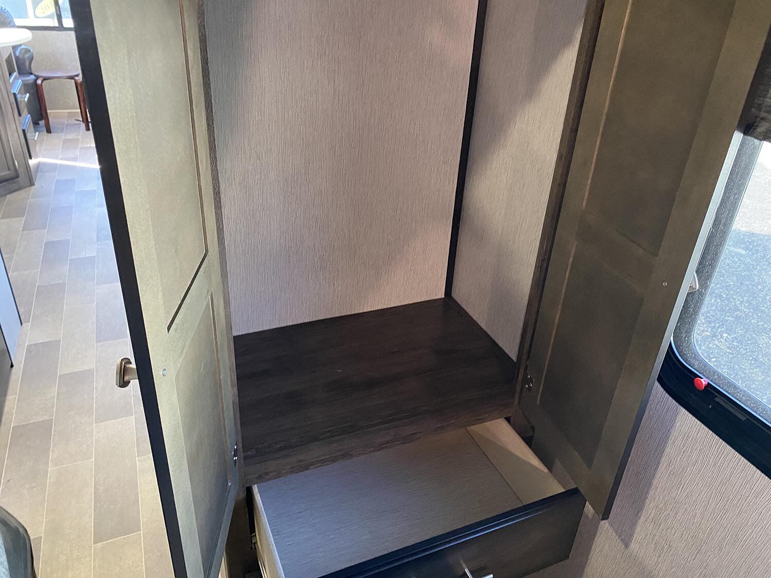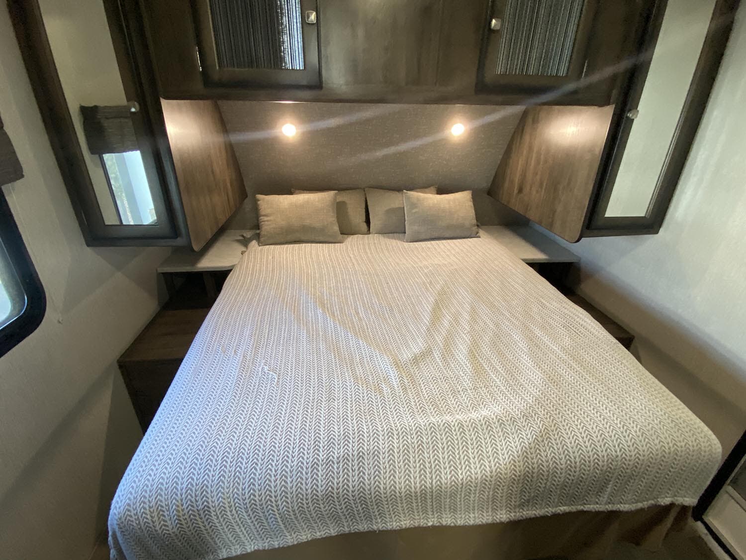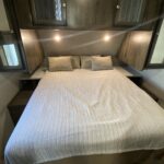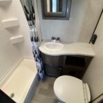 Arched ceiling with A/C and dual ducts • Aluminum construction • 2? Laminated sidewalls • Pull-out kitchen faucet • Large double door refer • Skylight in shower • Night shades • Tinted safety windows • Power Stabilizer jacks • Leaf spring suspension • King bed • Dual 20# LP tanks w/auto change over • Medicine cabinet • Fire extinguisher • Power vent in bathroom • Foot flush toilet • Gas/electric DSI water heater • Quick store bed base • 12 volt Radio/CD/DVD player with indoor and outdoor speakers • Cable ready hookup • Shower / Tub surround • Large 51 gallon fresh water capacity (Includes 6 gallon hot water heater) • 55 amp 12 volt power converter • Solar Prep • Steel ball bearing drawer guides • Wide trax axle system • E-Z lube hubs • Bumper w/hose storage • Forced air heated and enclosed underbelly • Black tank flush • Spare tire • Aluminum rims • Electric awning with LED lights • Finished and insulated pass-through storage • Slam baggage doors with magnetic latches • 13,500 BTU air conditioner • 50 Amp service w/ second A/C prep in model M301 and larger • Friction hinge entry door