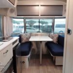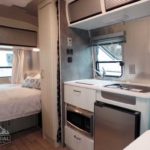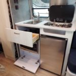2 Burner Cooktop (LP Gas) • Laminate Galley Top • Stainless Steel Sink • Laminate Dinette Top • Performatex Stain Resistant Dinette Cushions • Dinette Converts to a Lounge and Sleeping Accommodations • Flatware Organizer • JVC Stereo with Bluetooth Connectivity • 12v/110v LED HD TV with DVD and Omni Directional Antenna • Aluminum Blinds • Moen Faucet.