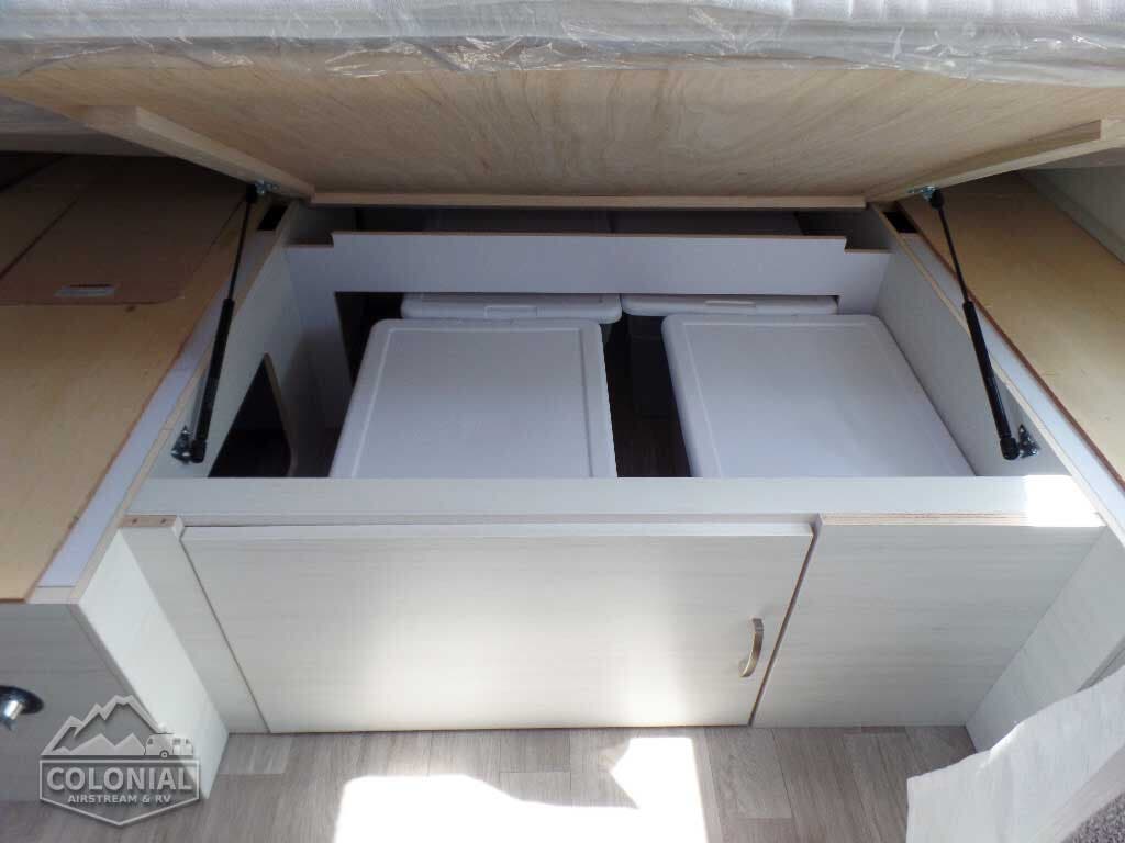 Complete Aluminum Interior Walls and Ceiling • AC with Heat Strip • Fan with Multiple Speeds • Probeless Tank Monitoring System • EcoBatt™ Insulation • Handcrafted Aluminum Screen Door • Panoramic Front Windows with Blackout Shades • Handcrafted Italian Lite-Ply Laminated Interior Cabinetry • Seamless Vinyl Flooring • LED Interior Lighting • Overhead Storage with Tambour Doors • Direct Spark Ignition LP Water Heater (6 gal.) • Coat & Key Hooks.
