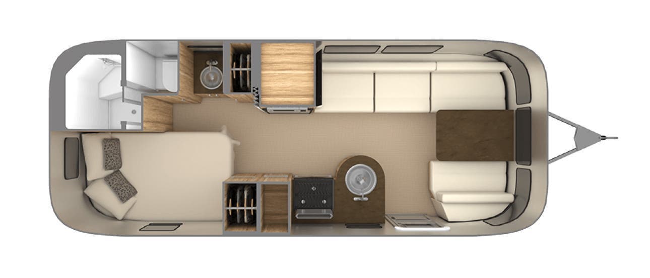 Semi-Monocoque Aluminum Superstructure • Fluorocarbon Treated UV Protected Aluminum Exterior • Temperature Reducing One Piece White Aluminum Roof • Thermal Barrier Protection Between Interior and Exterior • Hand Crafted Welded Extruded Aluminum Window Frames • Tempered Tinted Windows with Double Cam Latching System • Manual ZipDee® Patio Awning with Sunbrella Fabric • ZipDee® Rear & Roadside Window Awning with Sunbrella Fabric • LED Dimmable Patio Awning Light • Polished Bumper with Storage • LP (2 – 30 lb. Steel Tanks) with auto 2-stage regulator • Aluminum Removable LP Cover • 2 Deep Cycle Batteries Group 24 Series with Multi-Stage Converter • Exterior LP Gas Low Pressure Grill Connection • Solar Front Window Protection • Stainless Steel Front Stone Guard Protection • Exterior Shower with Hot & Cold Water • Lockable Fresh Water Tank Inlet • City Water Inlet with Water Pressure Regulator • Black Tank Flush System • Hand Painted Chassis • Torsion Axle Suspension • Shock Absorber • Powered Hitch Jack with Light • 4 Manual Heavy Duty Stabilizer Jacks • Goodyear Endurance ST225/75R15 Tires • Stylized Aluminum Wheels • Nev-R-Lube Sealed Bearings • Nev-R-Adjust Brakes • Spare Tire – Full Size • Solar Pre-wire (Rooftop & Front Access Points) • Rear View Monitoring System • Cable TV Hookup • Satellite TV Hookup • Dedicated Waste Hose Storage • Custom Aluminum Handcrafted 26 in. Wide Entry Door with Window • Aluminum Entry Door Handle • Unique Front Door Key with Heavy Duty Deadbolt • Cast Aluminum Door Hinges • Airstream Custom Aluminum Entry Step • LED Entrance Light • LED Tank Service Light • LED Storage Compartment Light • Cast Aluminum LED Tail Lights • Licence Plate Bracket with LED Light • Enclosed Aluminum Insulated Heated Underbelly.