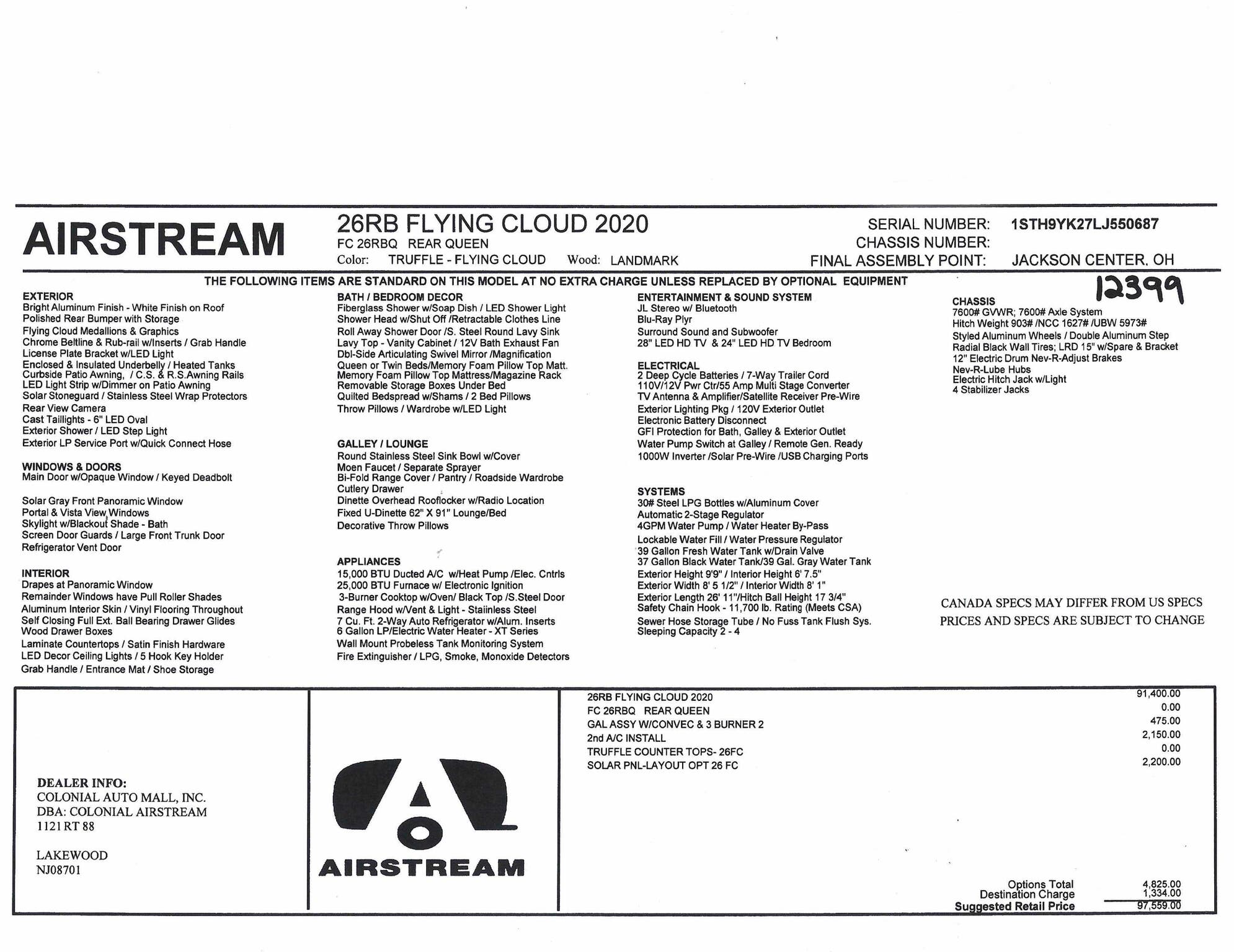 Model: 2020 – FLYING CLOUD STANDARD FEATURES