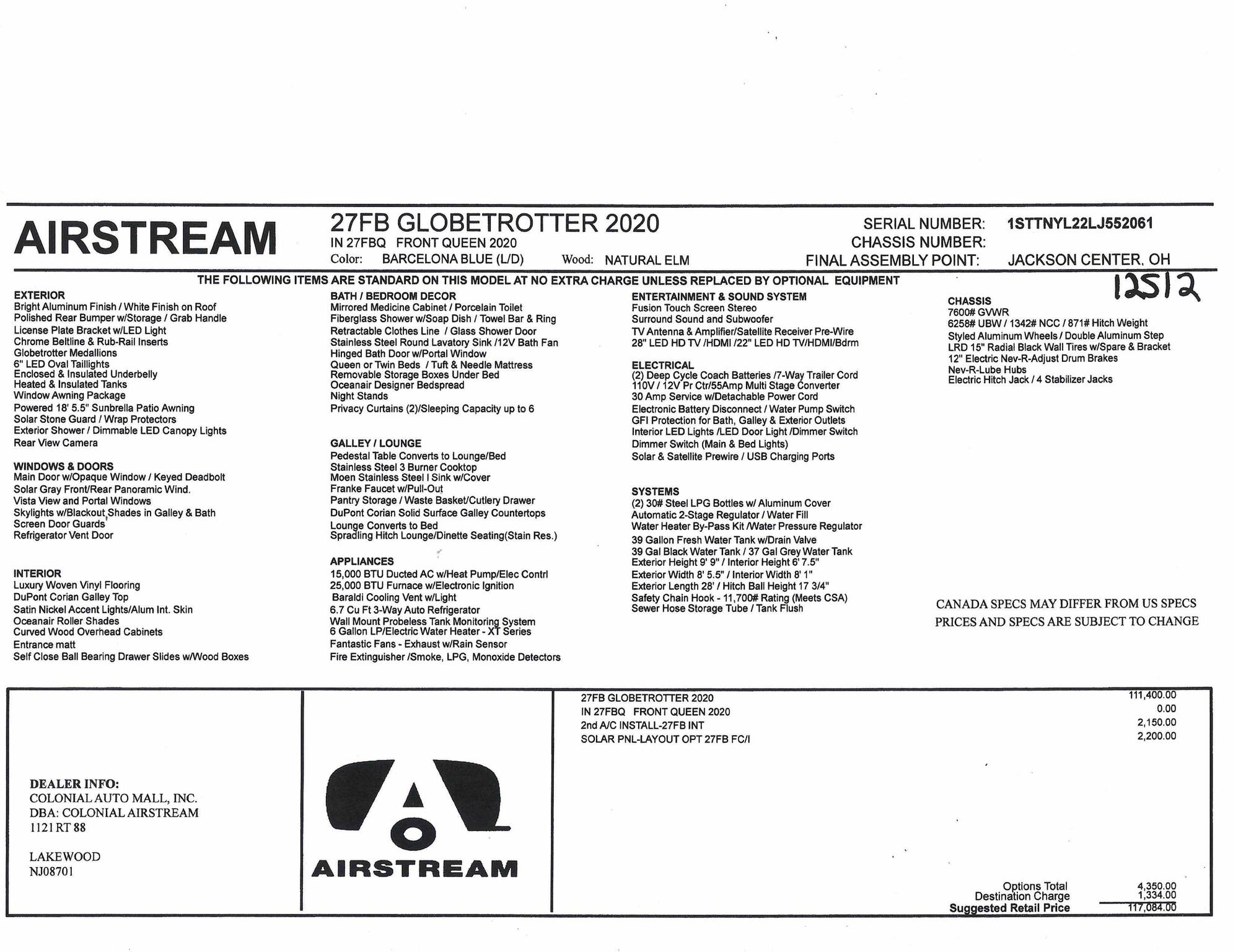 Airstream Logo Entrance Mat • Fire Extinguisher • Emergency Manual Crank for Powered Hitch Jack • LP, Smoke & Carbon Monoxide Detectors • Built In Winterization Kit • TRA Certified Green: Emerald Status (Highest Rating) • 3 Year Airstream Limited Warranty (Transferable) • 3 Year 24/7 Coach-Net® Roadside Assistance • Internally Routed A/C Condensation Drain Line to Wheel Well.