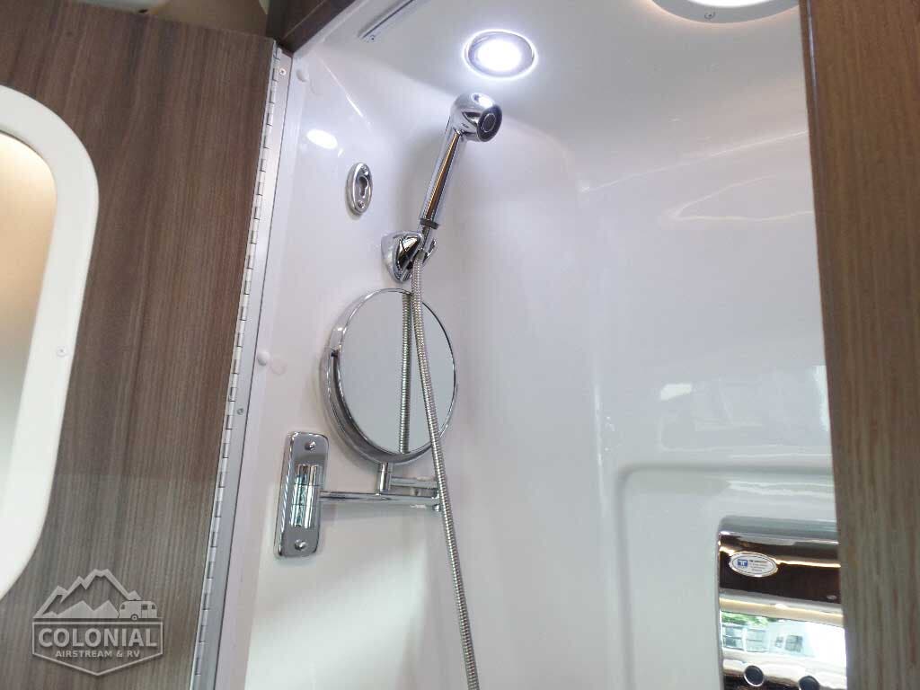 Toilet • Shower • Call Colonial RV For the Best Price 800 265-9019 • Sink with Articulated Mirror • Riveted Aluminum Porthole Door • Retractable Clothes Line • Towel Rack • LED Shower Lights