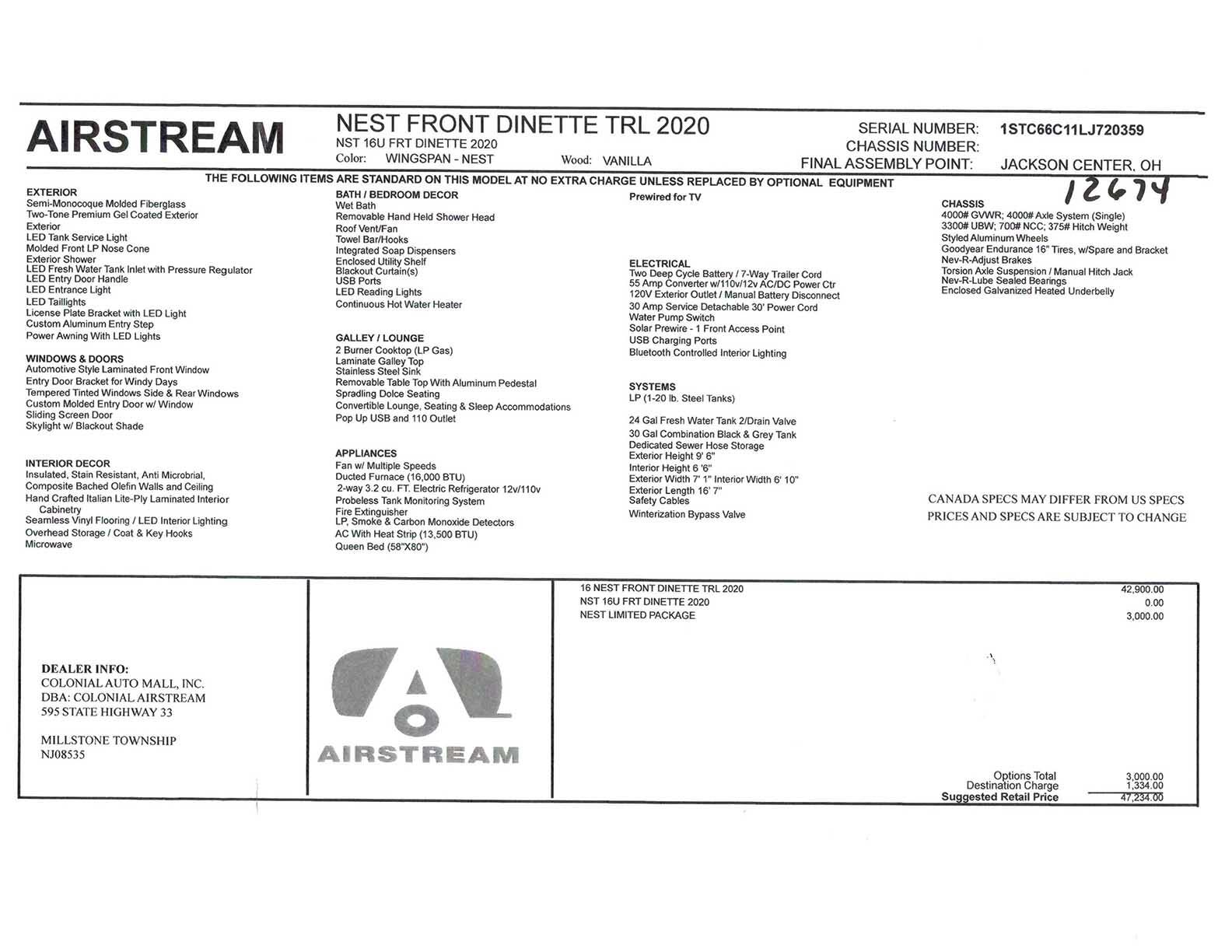 Semi-Monocoque Molded Fiberglass Superstructure • Two-Tone Premium Gel Coated Exterior • Automotive Style Laminated Front Window • Tempered Tinted Side and Rear Windows • Skylight with Blackout Shade • LP (1 – 20 lb. Steel Tank) • Molded Front LP Nose Cone • 2 Deep Cycle Group 24 Batteries with Multi-Stage Converter • Exterior LP Gas Low Pressure Grill Connection • Exterior Shower w/ Hot & Cold Water • City Water Inlet w/ Water Pressure Regulator • Hand Painted Chassis • Torsion Axle Suspension • Manual Hitch Jack • 4 Manual Stabilizer Jacks • Goodyear® Endurance 16” Tires, Balanced • Stylized Aluminum Wheels • Nev-R-Lube® Sealed Bearings • Nev-R-Adjust Brakes • Patio Awning with LED Lights • Spare Tire • Solar Pre-wire (1 Front Access Point) • Dedicated Waste Hose Storage • Molded Fiberglass Entry Door w/ Window (Blackout Shade) • LED Entry Door Handle • Unique Front Door Key w/ Heavy Duty Deadbolt • Airstream Custom Aluminum Entry Step • LED Entrance Light • LED Tail Lights • License Plate Bracket with LED Light • Entry Door Bracket for Windy Days • 2 Lockable Storage Compartments • Enclosed Galvanized Heated Underbelly