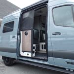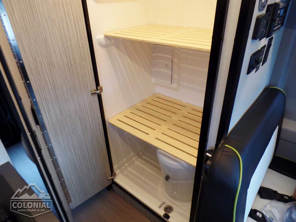 Flexible showerhead • Shower curtain • Wet Bath 31″x26″ • 2 removable shelves convert to wet storage cabinet • Removable clothes hanger • Swiveling cassette toilet • Powered roof vent
