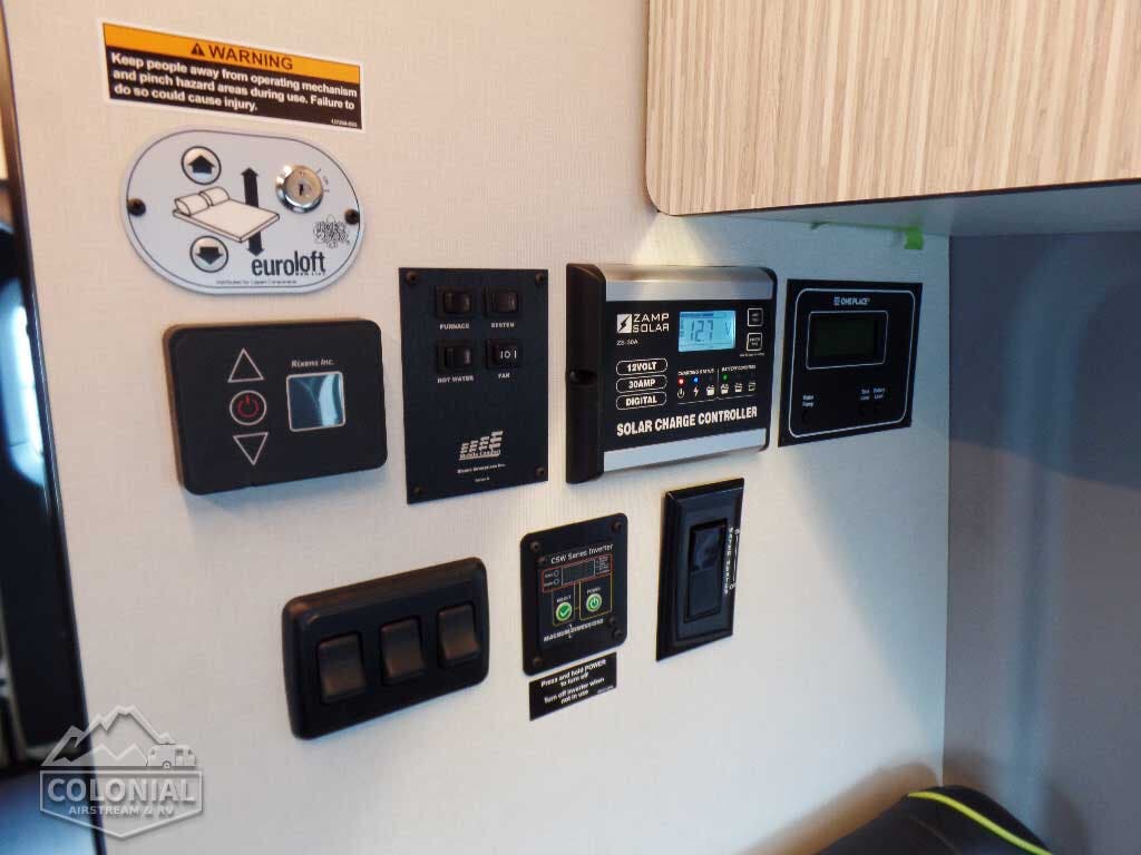 AC/DC load center/converter • 3 deep cycle Group 31 batteries (AGM maintenance free) • Coach battery disconnect system • Dual-battery charge system • 30-amp. power cord • Exterior AC receptacles • Exterior DC receptacles • Solar panel/battery charger • 2,000 watt AC/DC inverter