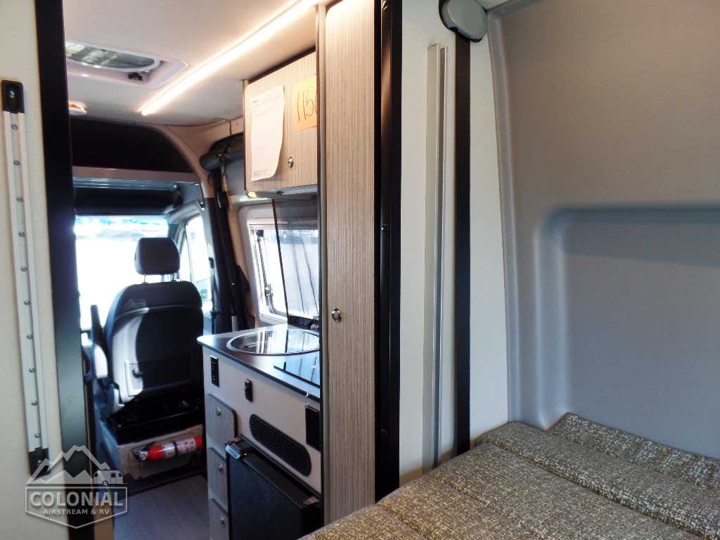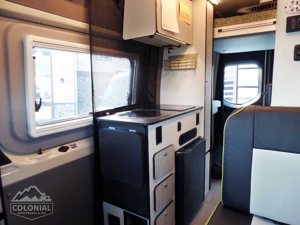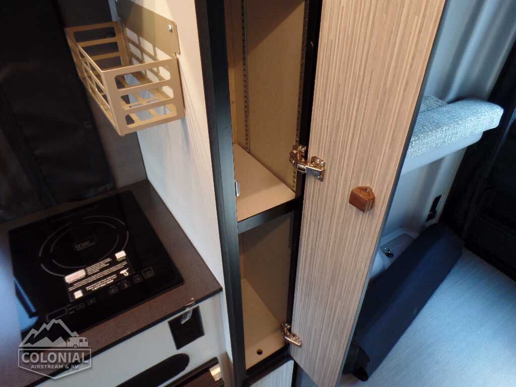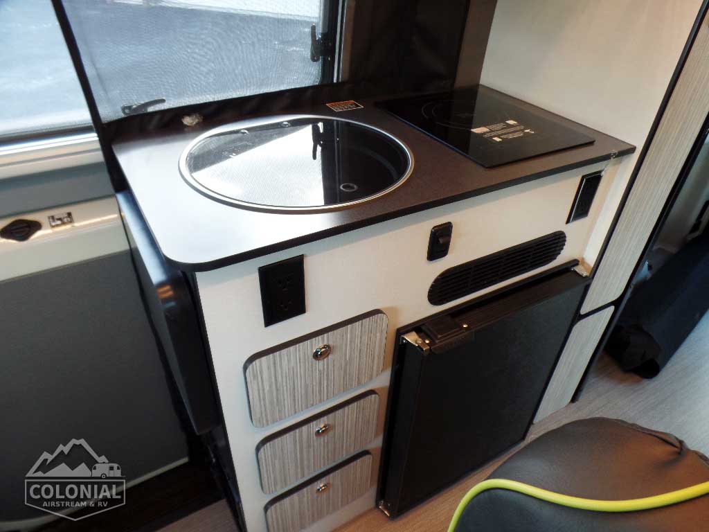 Flip-up countertop extension • Laminate countertop • Single burner induction range top • 2.5 cu. ft. compressor driven refrigerator/freezer • Stainless steel sink w/folding faucet and glass cover • Pantry • Pull-up dinette table • Full-extension drawers