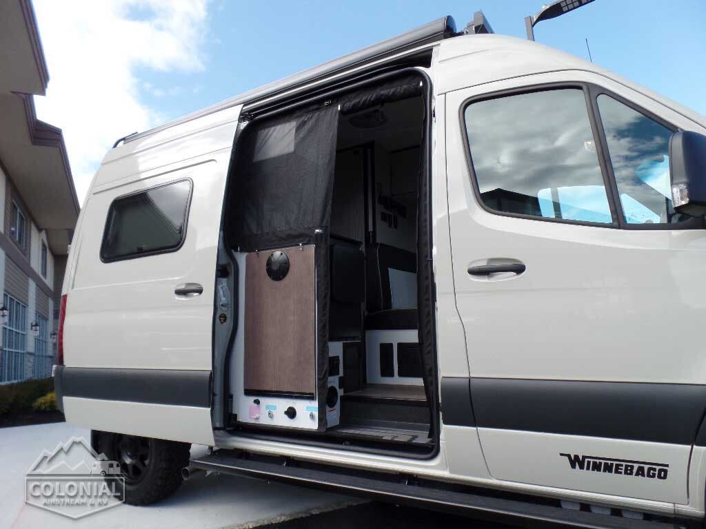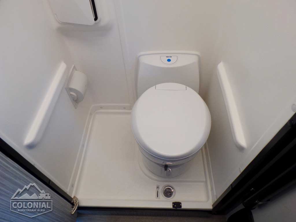 Flexible showerhead • Shower curtain • Wet Bath 31″x26″ • 2 removable shelves convert to wet storage cabinet • Removable clothes hanger • Swiveling cassette toilet • Powered roof vent