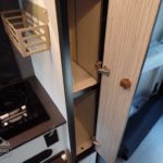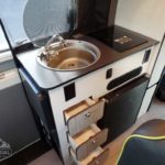 Flip-up countertop extension • Laminate countertop • Single burner induction range top • 2.5 cu. ft. compressor driven refrigerator/freezer • Stainless steel sink w/folding faucet and glass cover • Pantry • Pull-up dinette table • Full-extension drawers