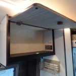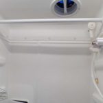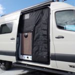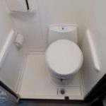 Flexible showerhead • Shower curtain • Wet Bath 31″x26″ • 2 removable shelves convert to wet storage cabinet • Removable clothes hanger • Swiveling cassette toilet • Powered roof vent