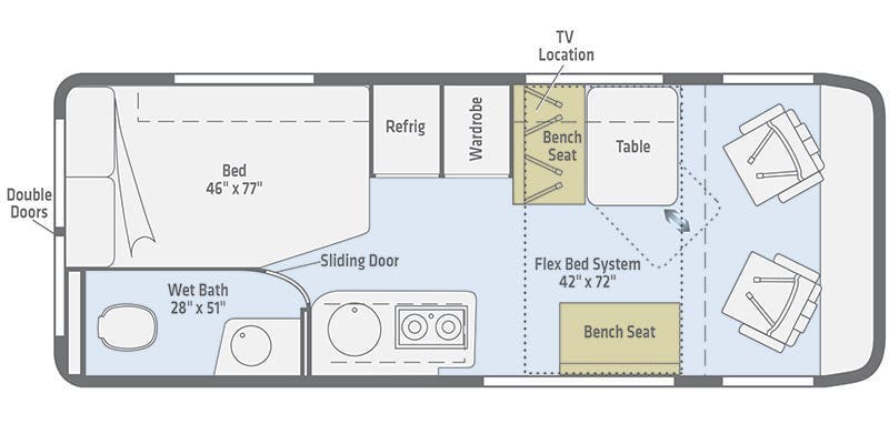 Double bed w/access to storage below and mattress cover (59G, 59GL) • Twin beds w/storage below passenger side (59K, 59KL) • Flex Bed kit (59K, 59KL) • Deluxe FROLI® Sleep System
