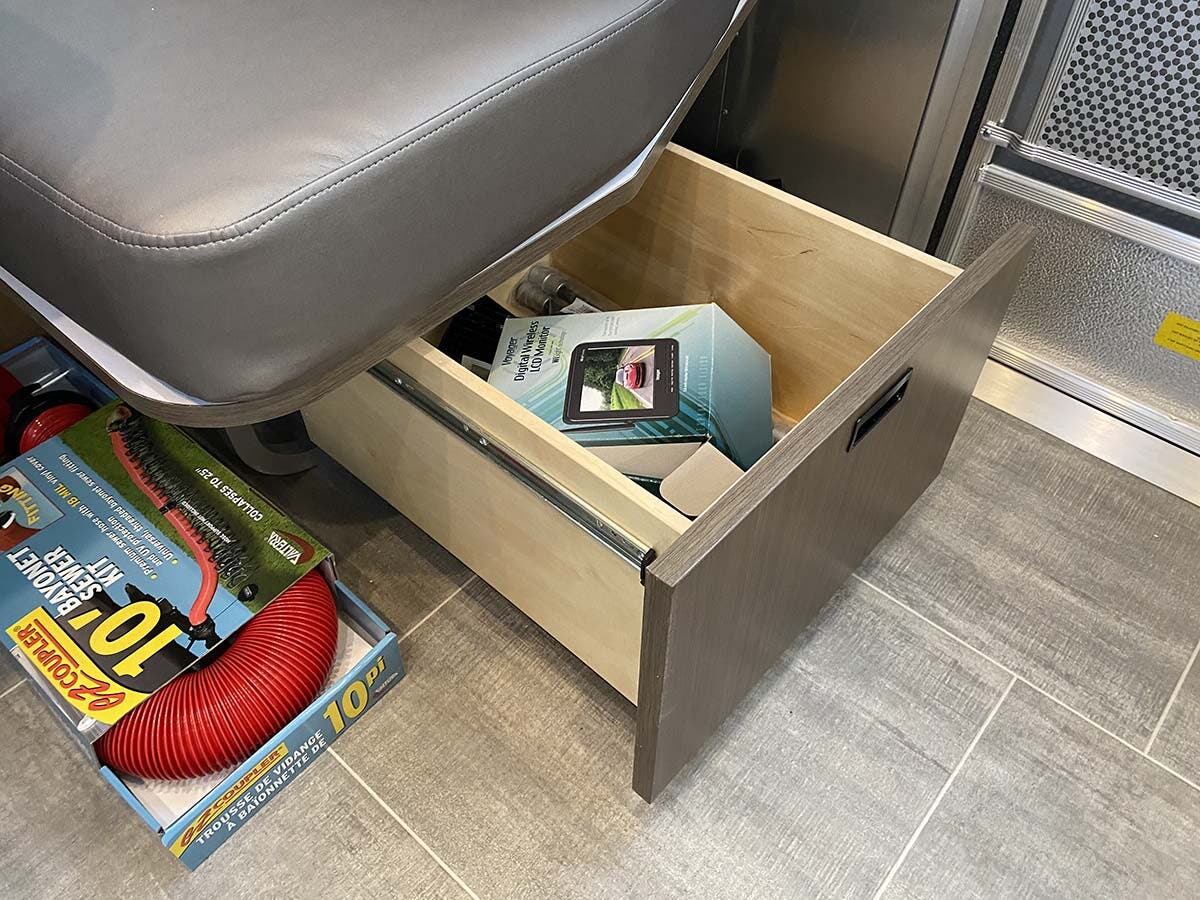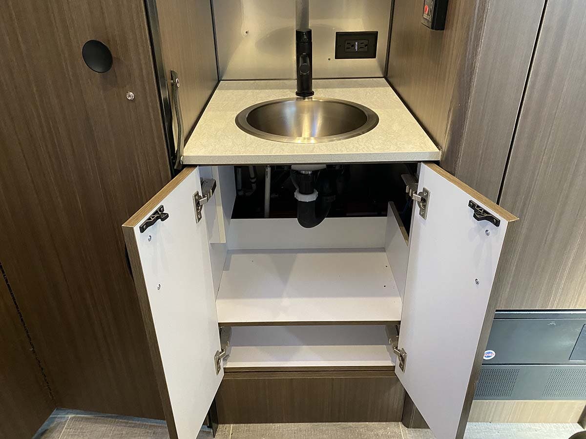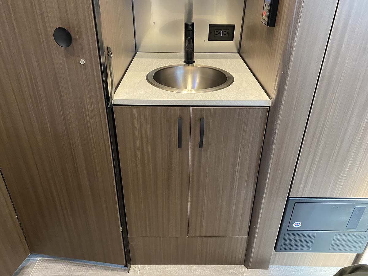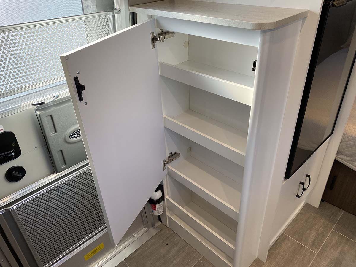 Complete Aluminum Interior Walls and Ceiling • Quietstream™ A/C with Heat Pump & Electronic Thermostat • Fantastic© Fan with Thermostat & Automatic Rain Sensor • Probeless Tank Monitoring System • EcoBatt™ Insulation • Handcrafted and Welded Aluminum Screen Door with Guards • Panoramic Front Windows with Blackout Shades • Handcrafted Italian Lite-Ply Laminated Cabinetry • Seamless Vinyl Flooring • LED Interior Lighting with Dimmer • Overhead Storage with Sliding Doors • Electric/LP Water Heater (6 gal.; 9 gal. production) • 1000W Pure Sine Inverter • Coat & Key Hooks