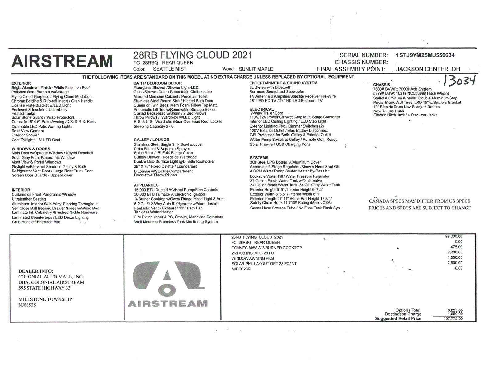 Model: 2021 – FLYING CLOUD STANDARD FEATURES