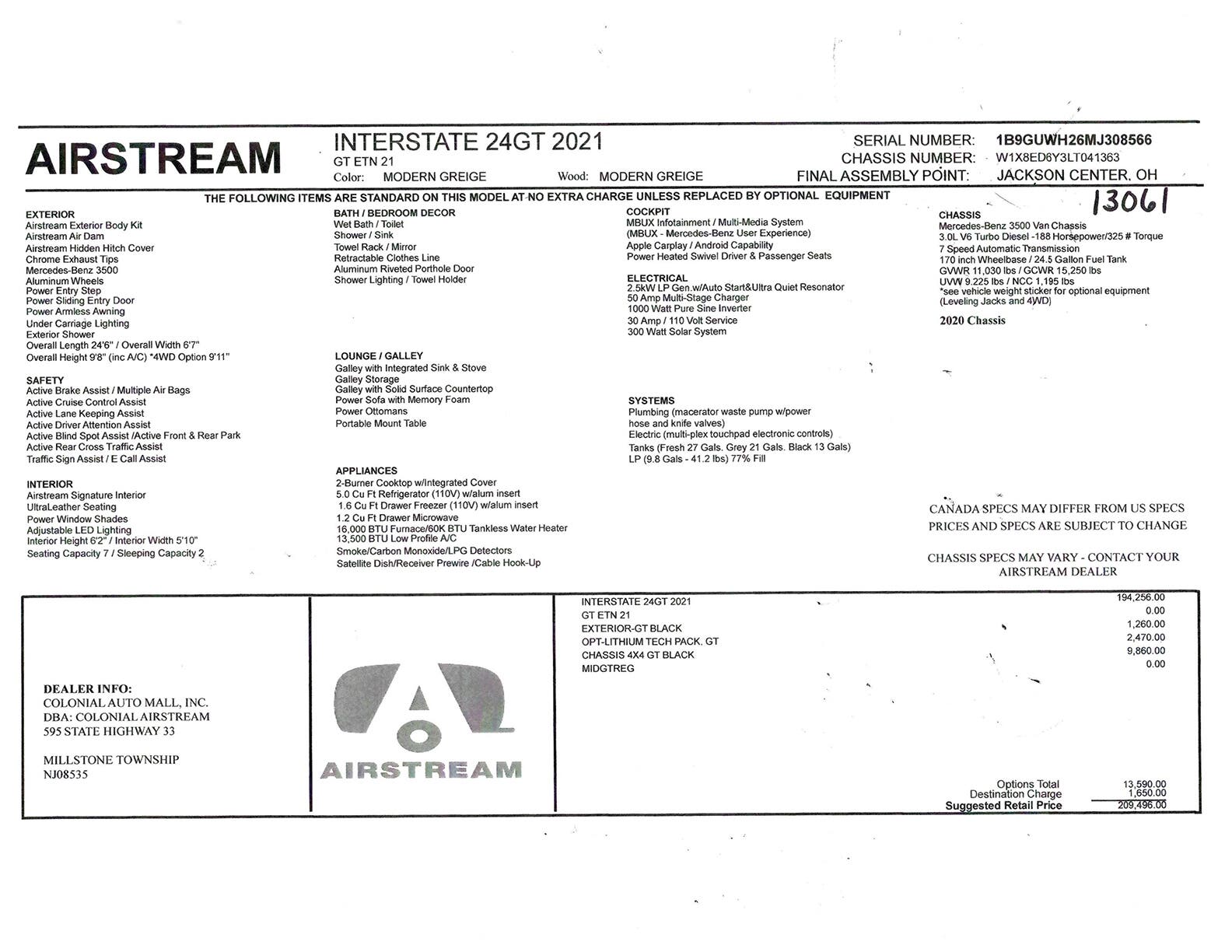 Mercedes-Benz® Sprinter 3500 • Mercedes-Benz® 3.0L V6 Turbo Diesel • BlueTEC SCR Technology, 50 State – EPA/CARB Standards • 188 HP / 325 lbs torque • 7 Speed Automatic • 170” Wheelbase • GVWR 11,030 lbs / NCC 1,195 lbs • UVW 9,416 lbs / OCCC 1,614 lbs • 24′ 6″ Exterior length • 6’7” Exterior Width • 9’8” Exterior Height (9’ 11” 4X4) • Multiple Safety Air Bags • Active Brake Assist • Active Lane Keeping Assist • Active Blind Spot Assist • Active Cruise Control Assist • Active Driver Attention Assist • Active Rear Cross Traffic Assist • E-Call Assist • Traffic Sign Assist • Front & Rear Parktronic Parking Assist • Wet Wiper System • Rear Camera Assist